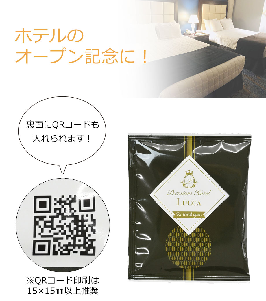 パッケージにフルカラー印刷が可能。周年記念や開店記念、内祝いや結婚式のプチギフトまで幅広いシーンで活躍します。裏面には産地や精米時期が記載されているので、受け取る側も安心です。日本らしいユニークなノベルティとして人気です。