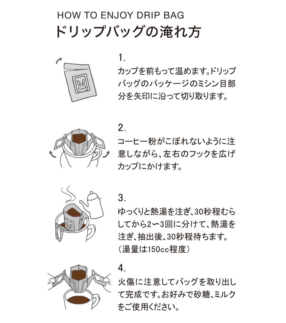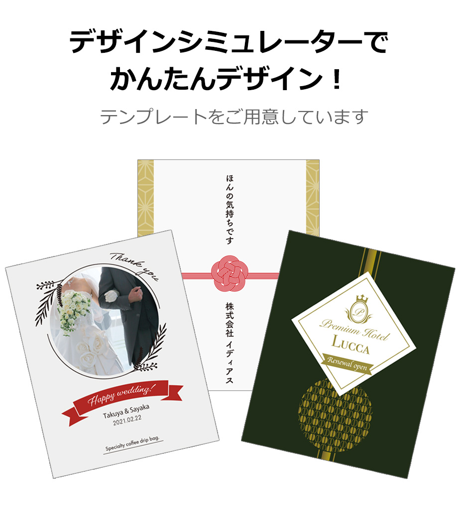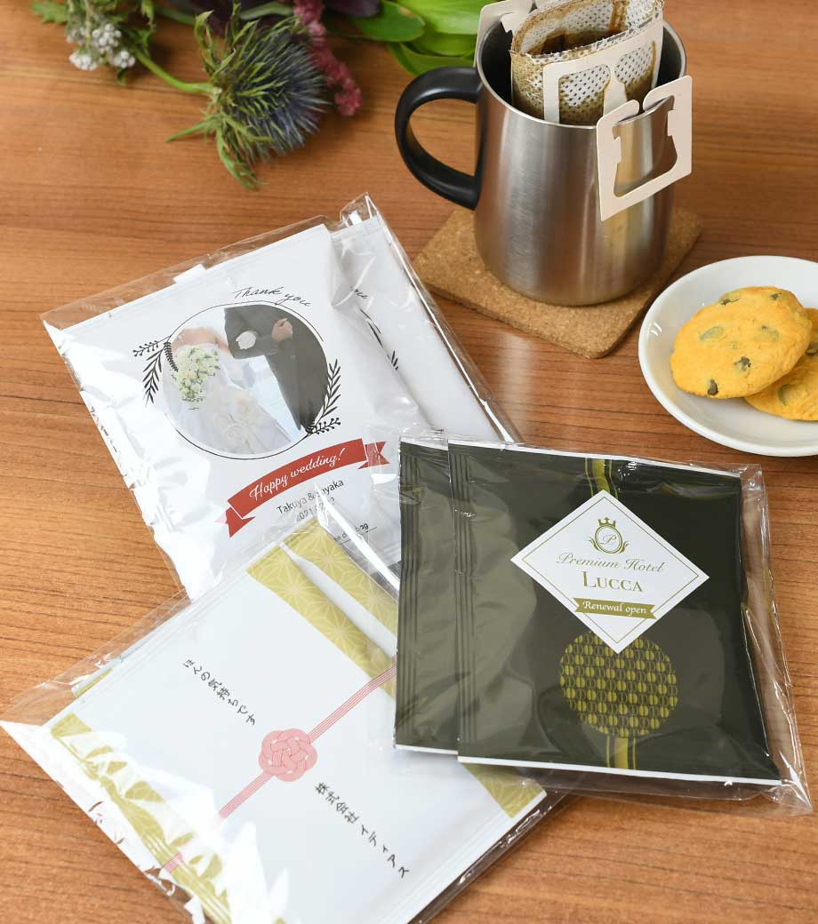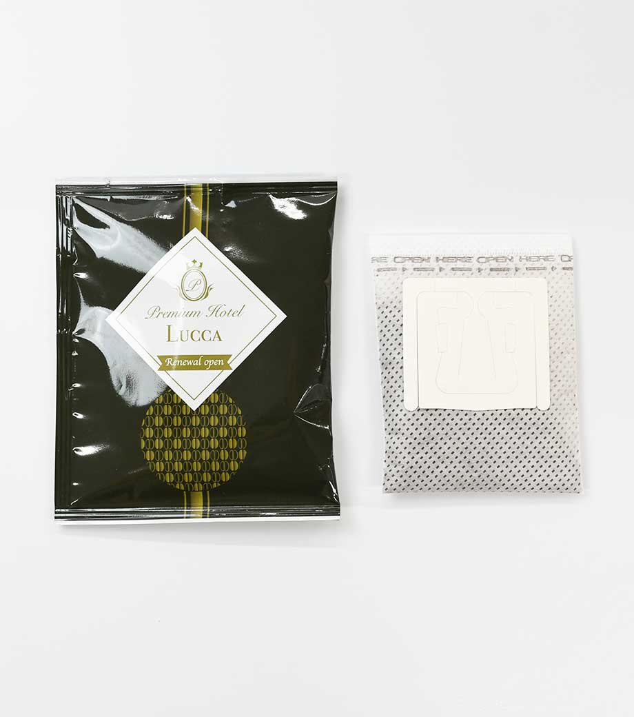 誰でも簡単においしいコーヒーが淹れられるドリップバッグは、日常の中にちょっとした安らぎの時間を与えてくれます。貰って嬉しいノベルティになること間違いなしの逸品です。