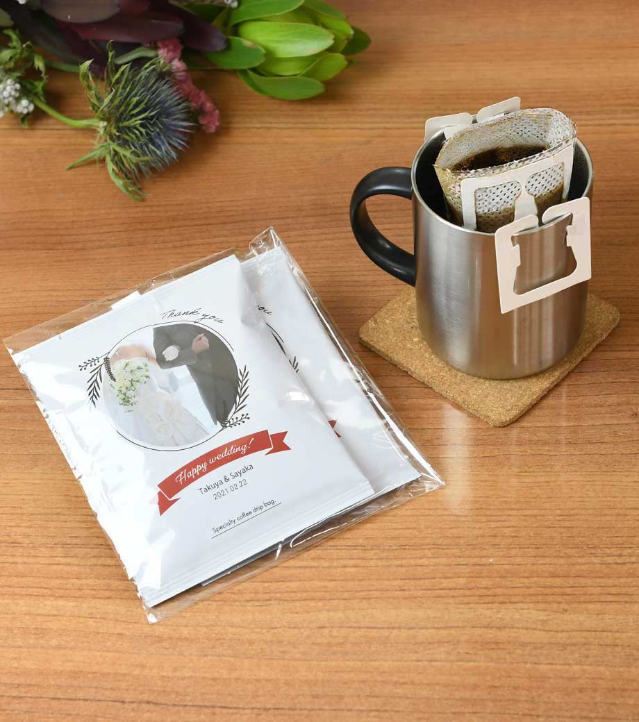 【オリジナルパッケージ】ドリップバッグコーヒー(2個ずつOPP袋入り)は、オリジナルデザインでパッケージが制作できるコーヒー。2個をOPP袋に入れることでプチギフト感を演出。フルカラーの印刷がよく映えます。周年記念に企業名を入れて社員へ配布したり、ブランドロゴをプリントしてオリジナルグッズとして販売したりと、様々な場面で大活躍!写真もきれいに印刷できます。