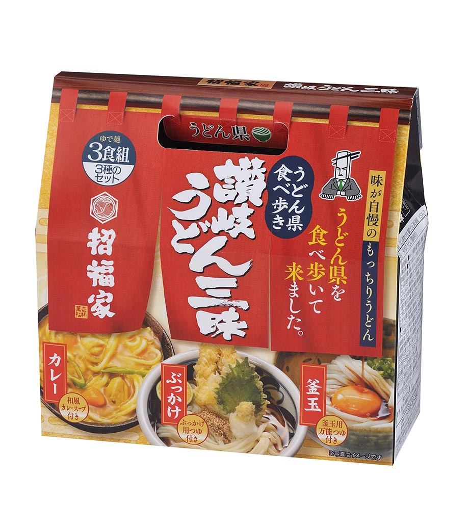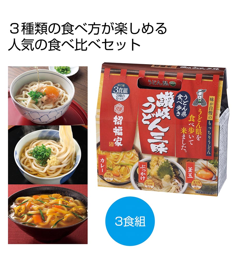 招福家 うどん県食べ歩き 讃岐うどん三昧3食組は、讃岐うどんの人気メニュー「カレーうどん」「ぶっかけうどん」「釜玉うどん」のつゆをセットにした商品です。 たっぷり熟成したこだわりの麺は、茹でればもっちりとした歯応えに。特殊なフィルムに入れて蒸気殺菌しているので、約5ヶ月間安定して日持ちします。