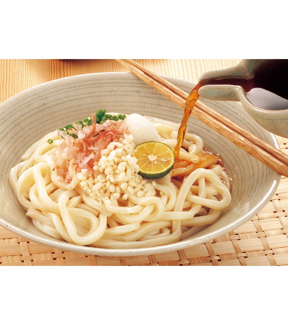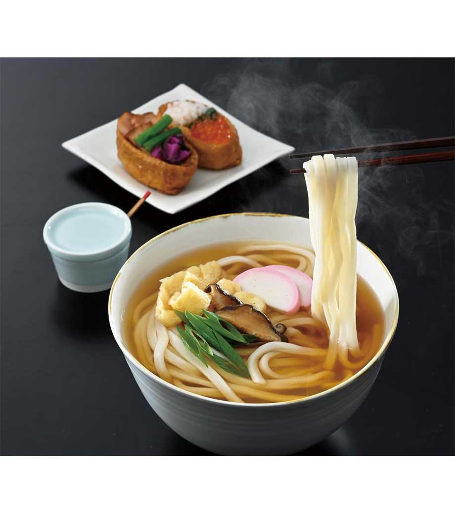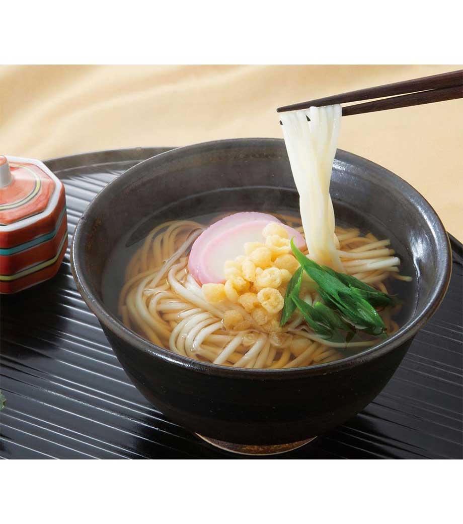 うどんは熟成仕込み。小麦の風味と旨味を生かし、讃岐うどんならではのもちもちとした「コシ」とのどごしが楽しめます。挨拶まわりの粗品や、車関係の来店記念品などに喜ばれます。箱の切り込みには名刺以外にサービス券や告知チラシなど差してお渡しもできます。