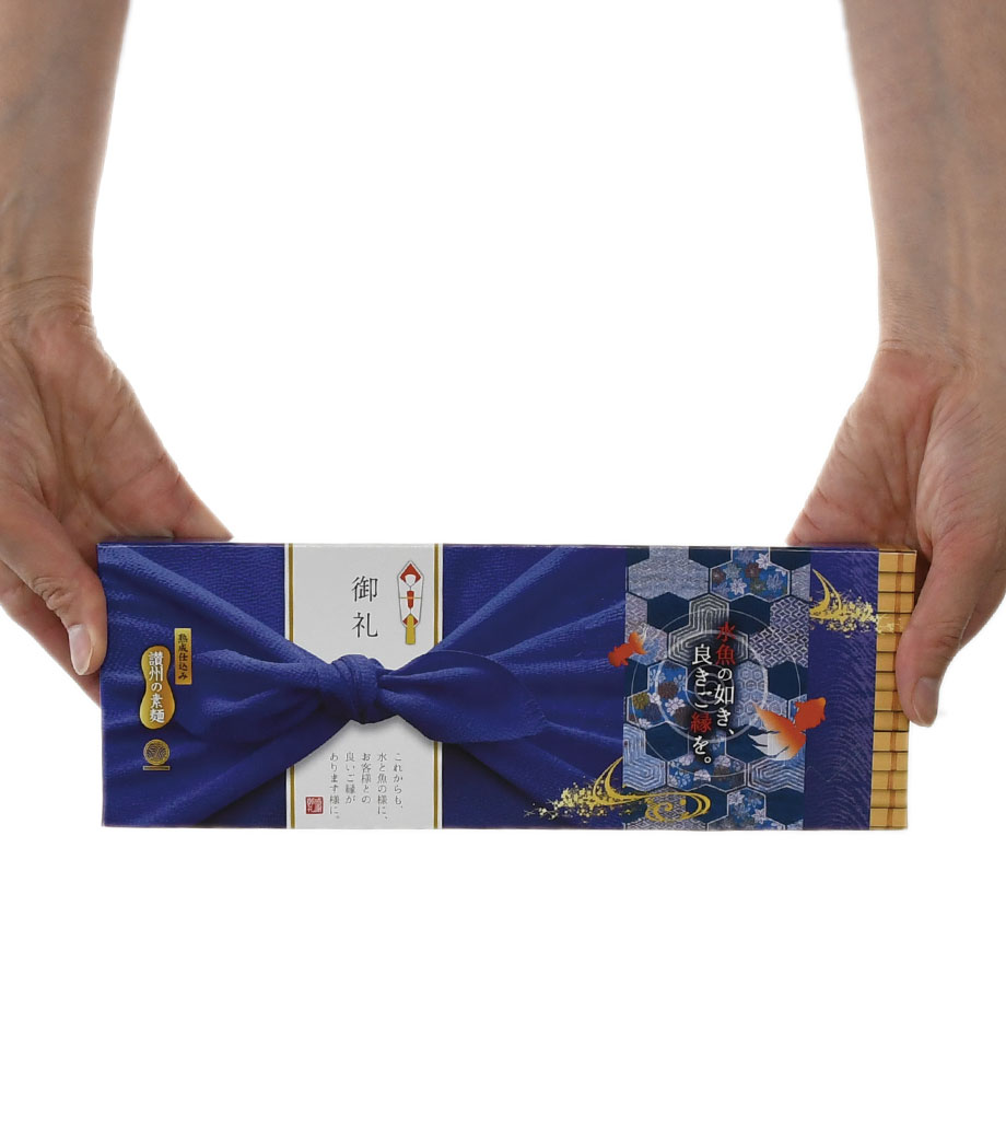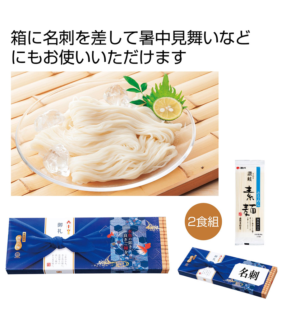 讃岐そうめん2食組 水魚の如き 良きご縁をは箱に名刺を差せる、ご挨拶に便利な讃岐素麺。パッケージには「御礼」の熨斗がプリントされ、感謝を伝えるツールとして活用いただけます。