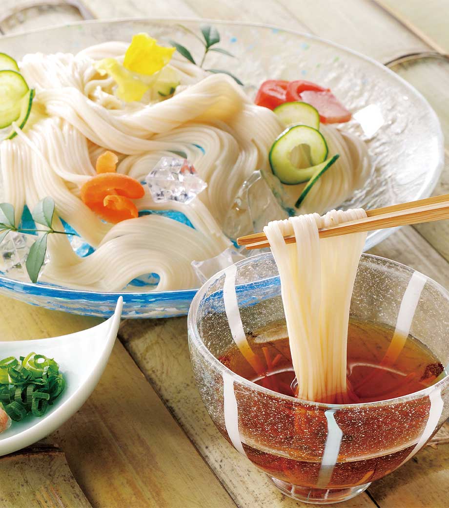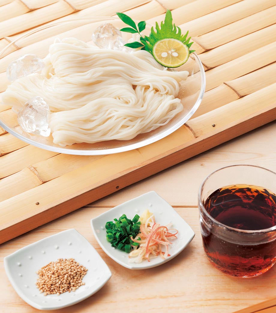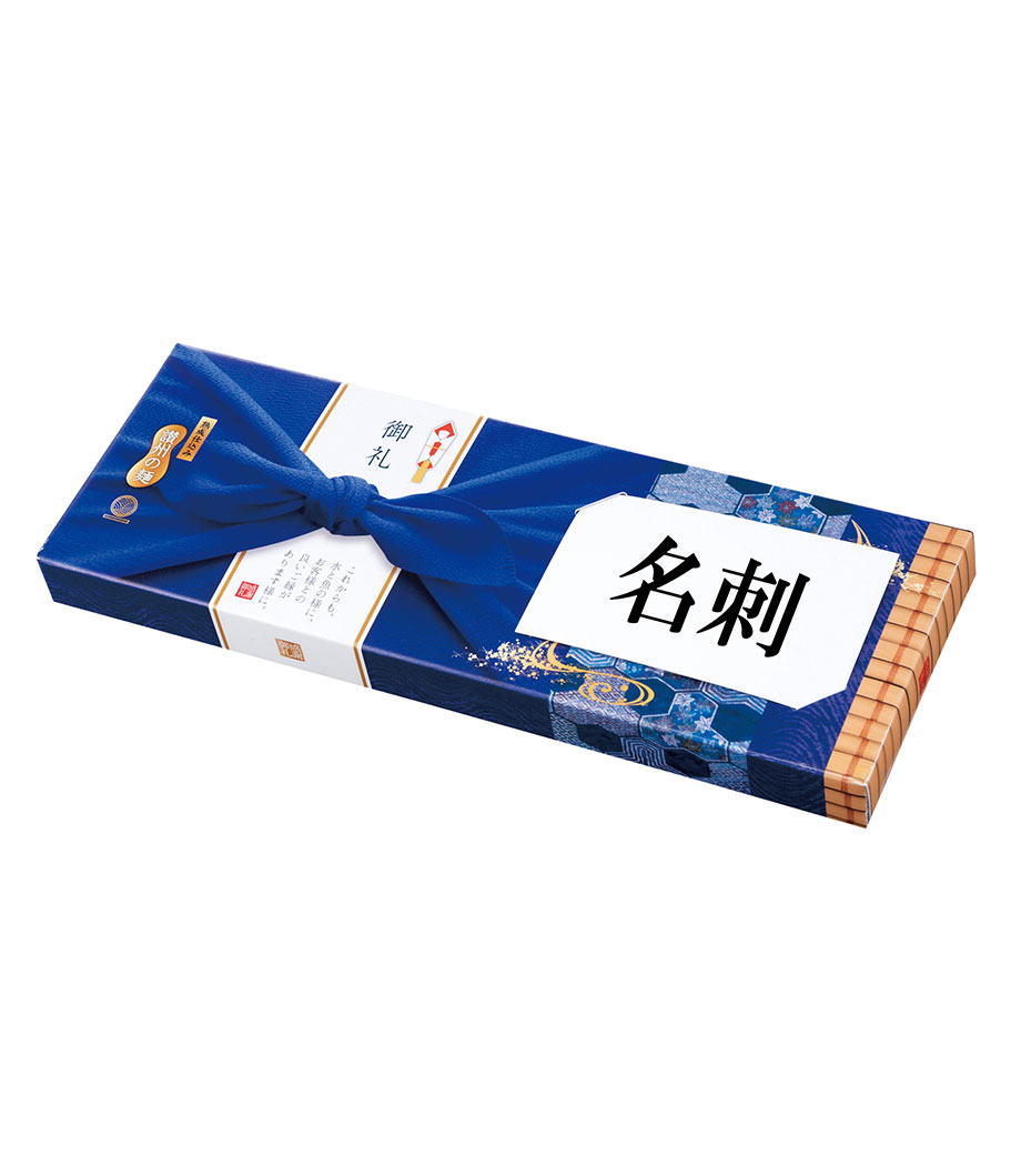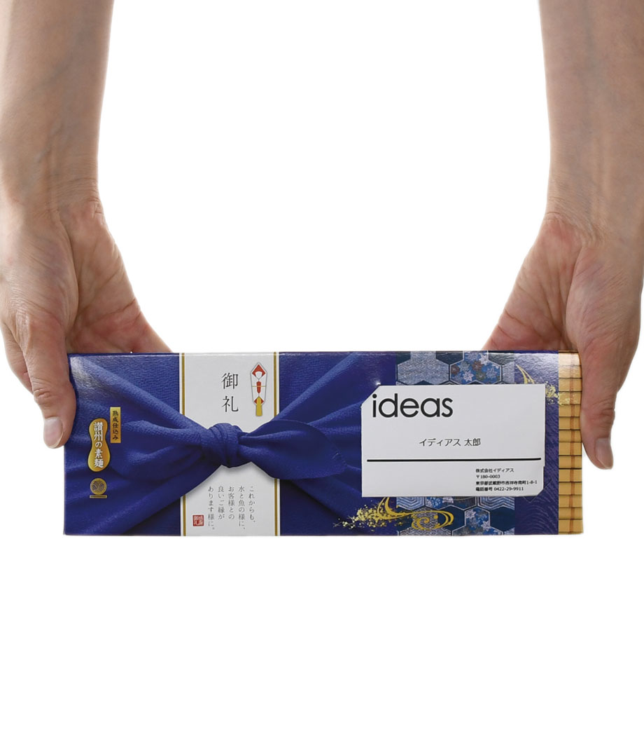 そうめんは熟成仕込み。小麦の風味と旨味を生かし、滑らかな口当たりです。夏場の営業訪問用や、サマーイベントの来場記念品などに喜ばれます。箱の切り込みには名刺以外にサービス券や告知チラシなど差してお渡しもできます。