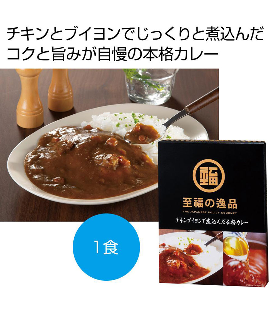 至福の逸品 チキンブイヨンで煮込んだ本格カレー1食はコクと旨みにこだわったレトルトカレー。丁寧に煮込まれたビーフカレーは味と香りに深みがあり、一口食べると幸せな気分になります。