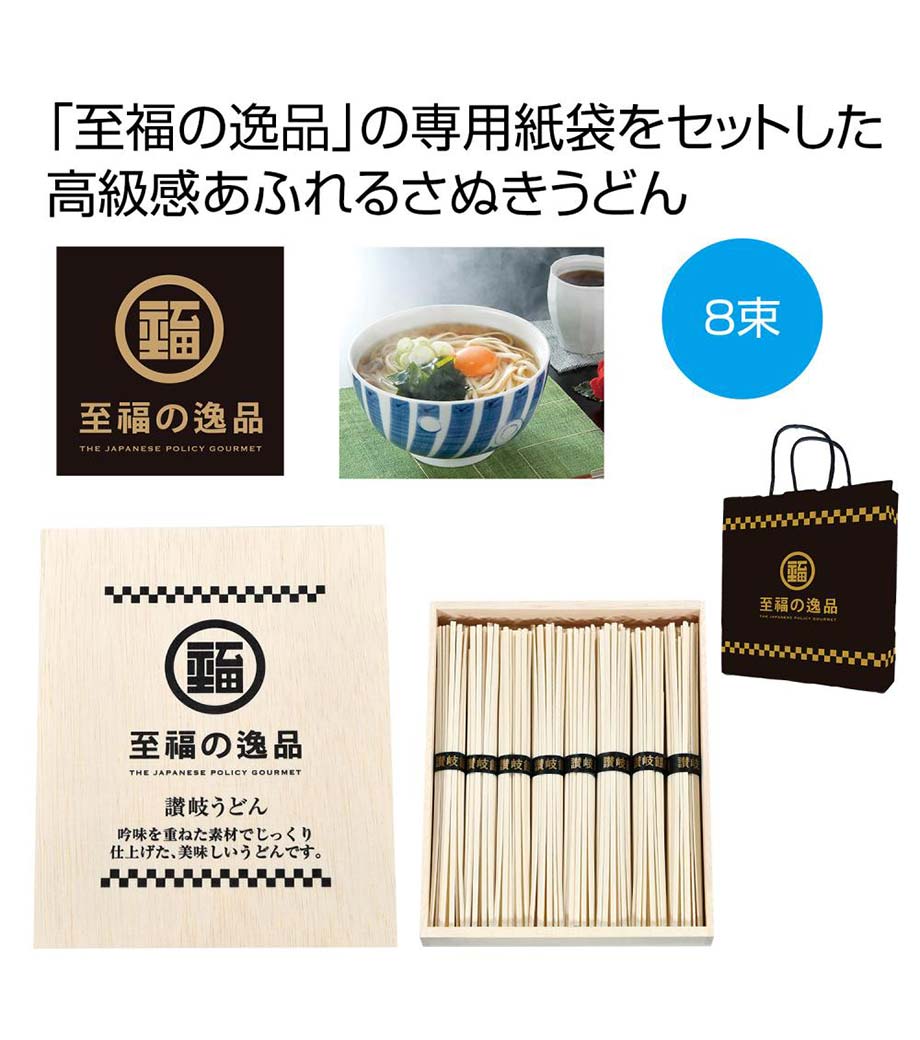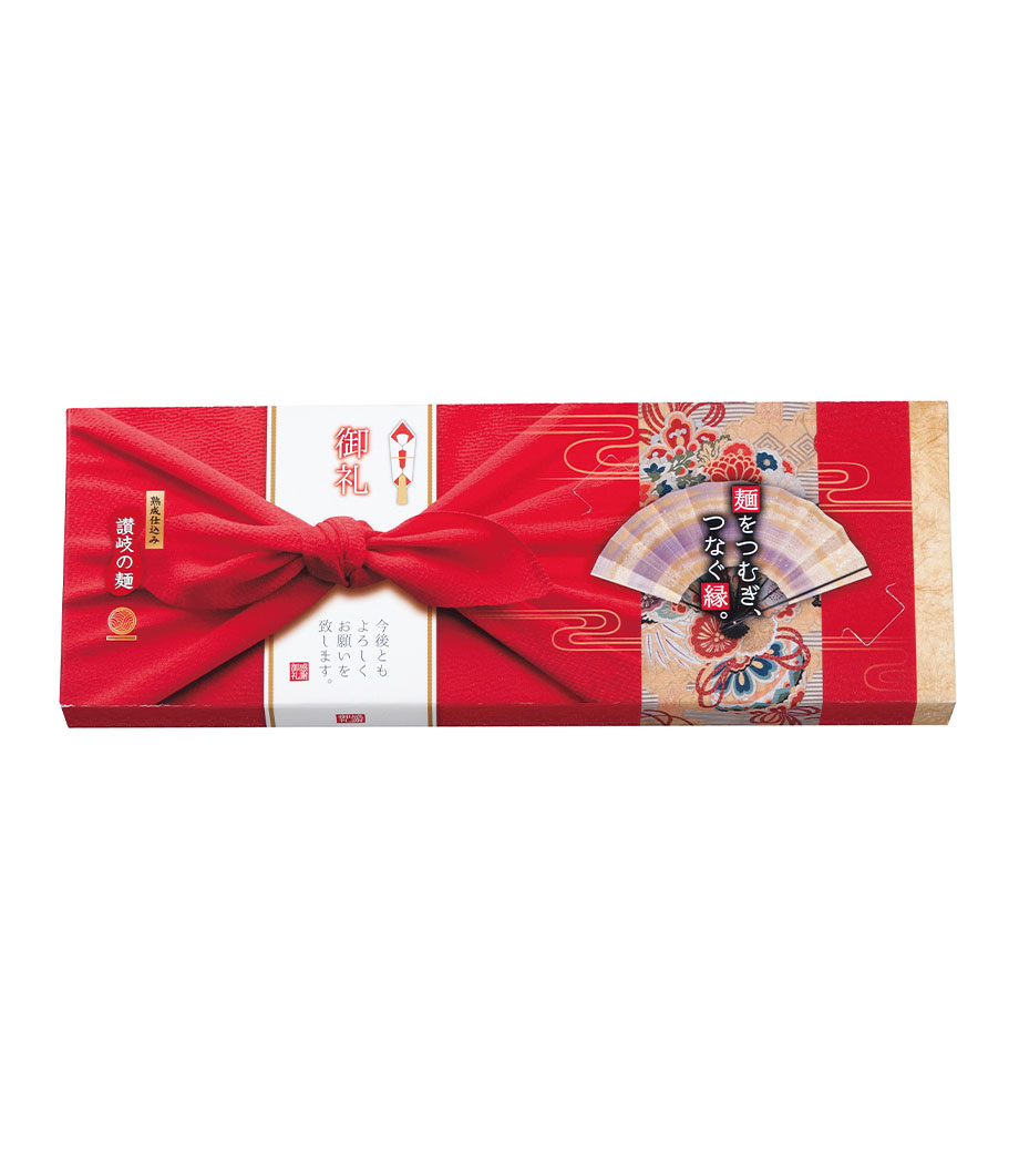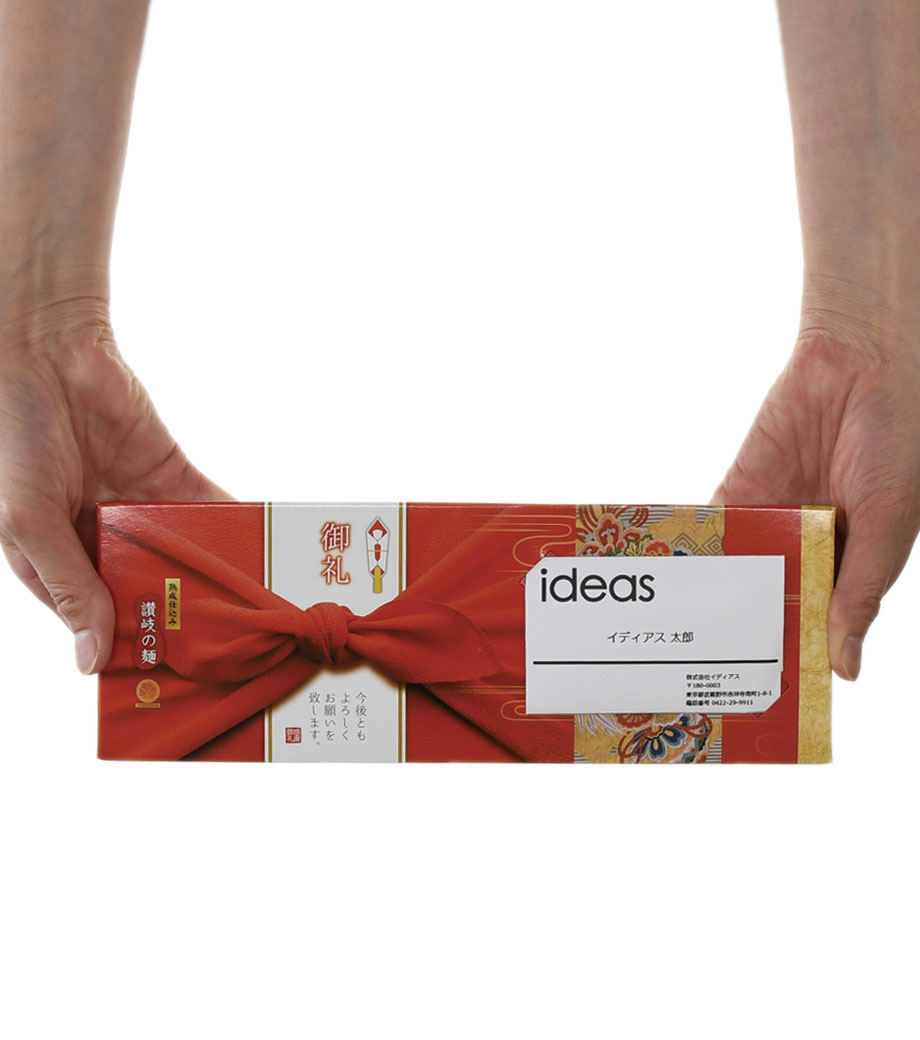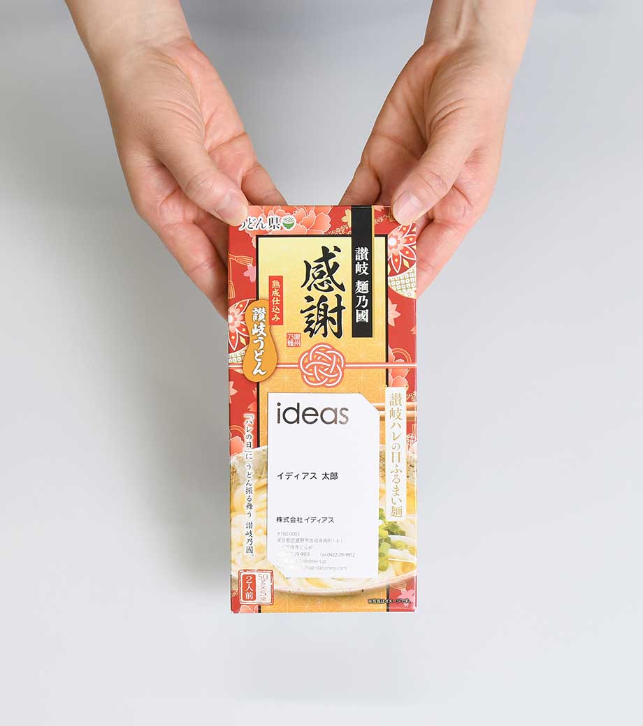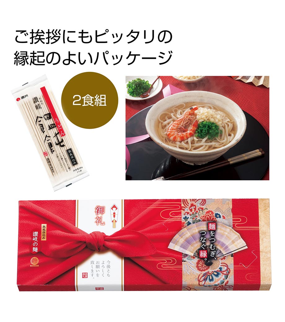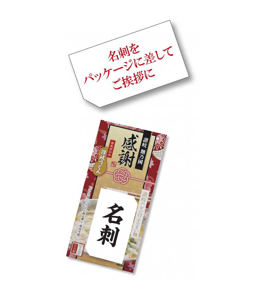 讃岐うどん2人前「麺をつむぎつなぐ縁」は箱に名刺を差せる、ご挨拶に便利な讃岐うどん。パッケージには「御礼」の熨斗がプリントされ、感謝を伝えるツールとして活用いただけます。