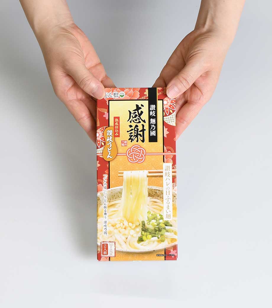 パッケージには「感謝」の文字と「運命向上」の意味がある梅結びの熨斗がデザインされています。うどんで有名な香川県では特別な日やお客様のおもてなしにうどんを振舞うのがしきたり。渡す際におもてなしの思いと感謝の気持ちを一緒に伝えてみてはいかがでしょうか。