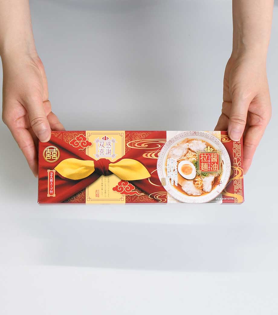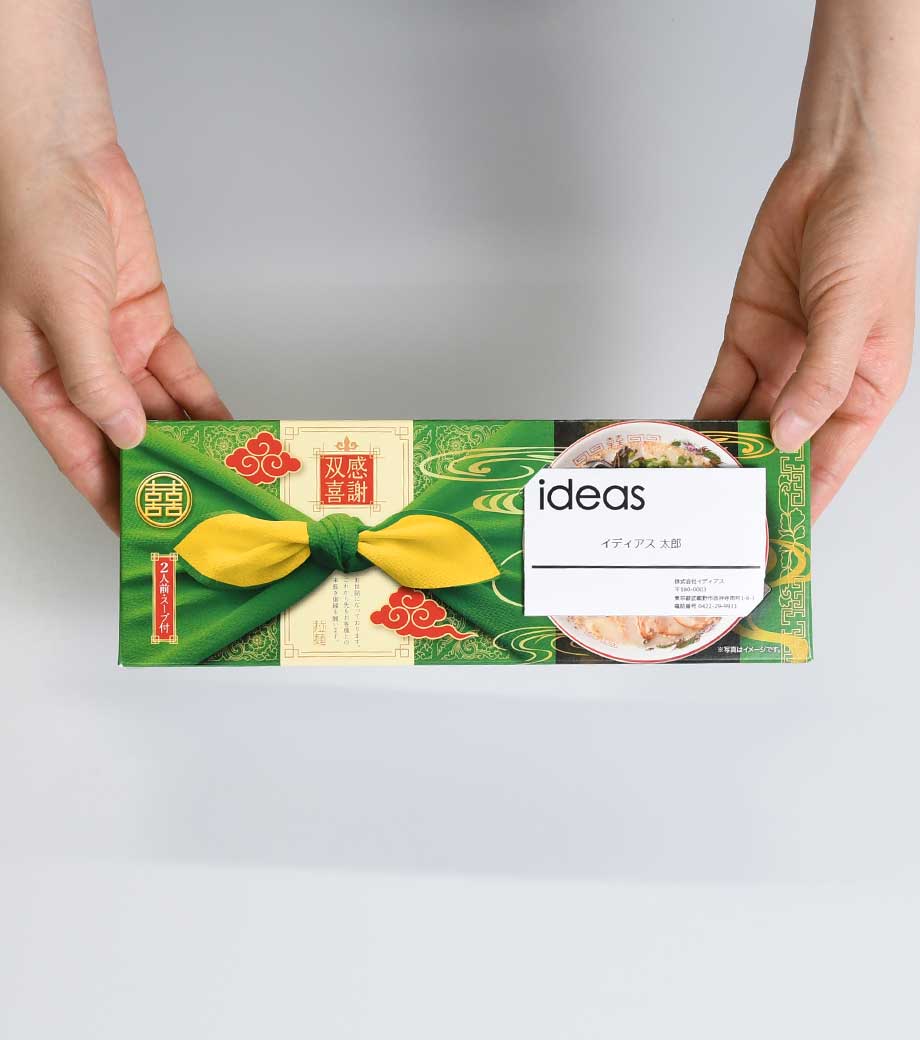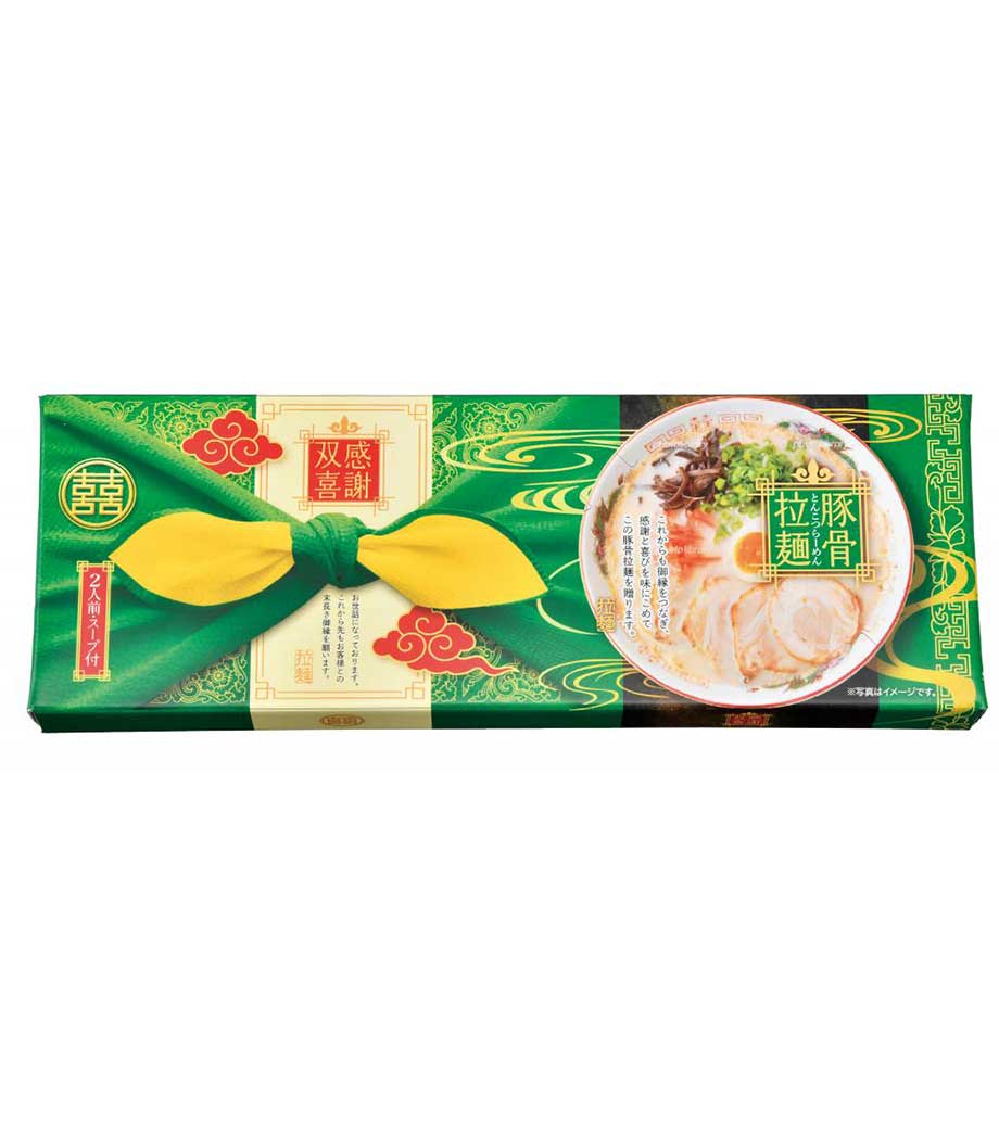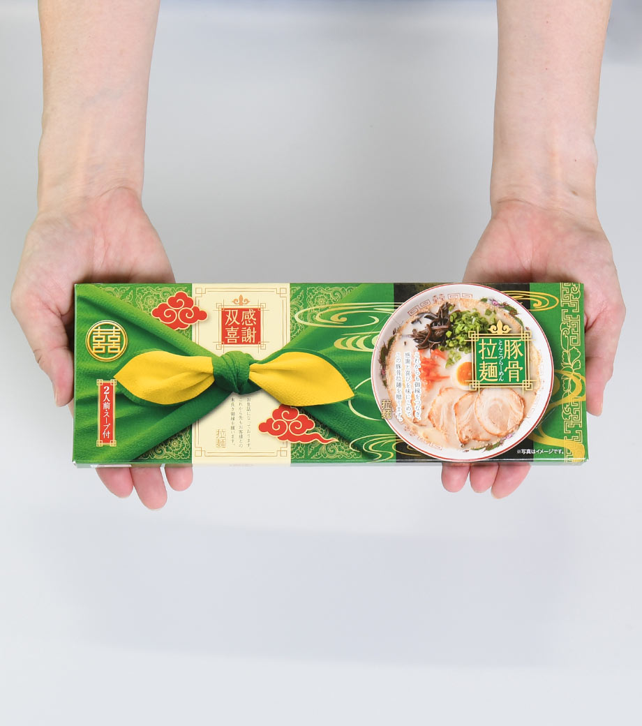 感謝双喜 ラーメン2食組 1箱(豚骨)はカードを差し込める仕様の化粧箱。名刺やショップカードと一緒に挨拶品や御礼品としてお渡しできます。風呂敷に包まれたプリントパッケージは感謝の気持ちをより一層伝えられます。化粧箱に書かれた「感謝双喜」の双喜は「感謝と共に、二重の喜び(慶事)が訪れることを願っています」という意味です。