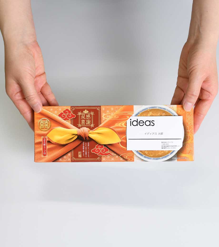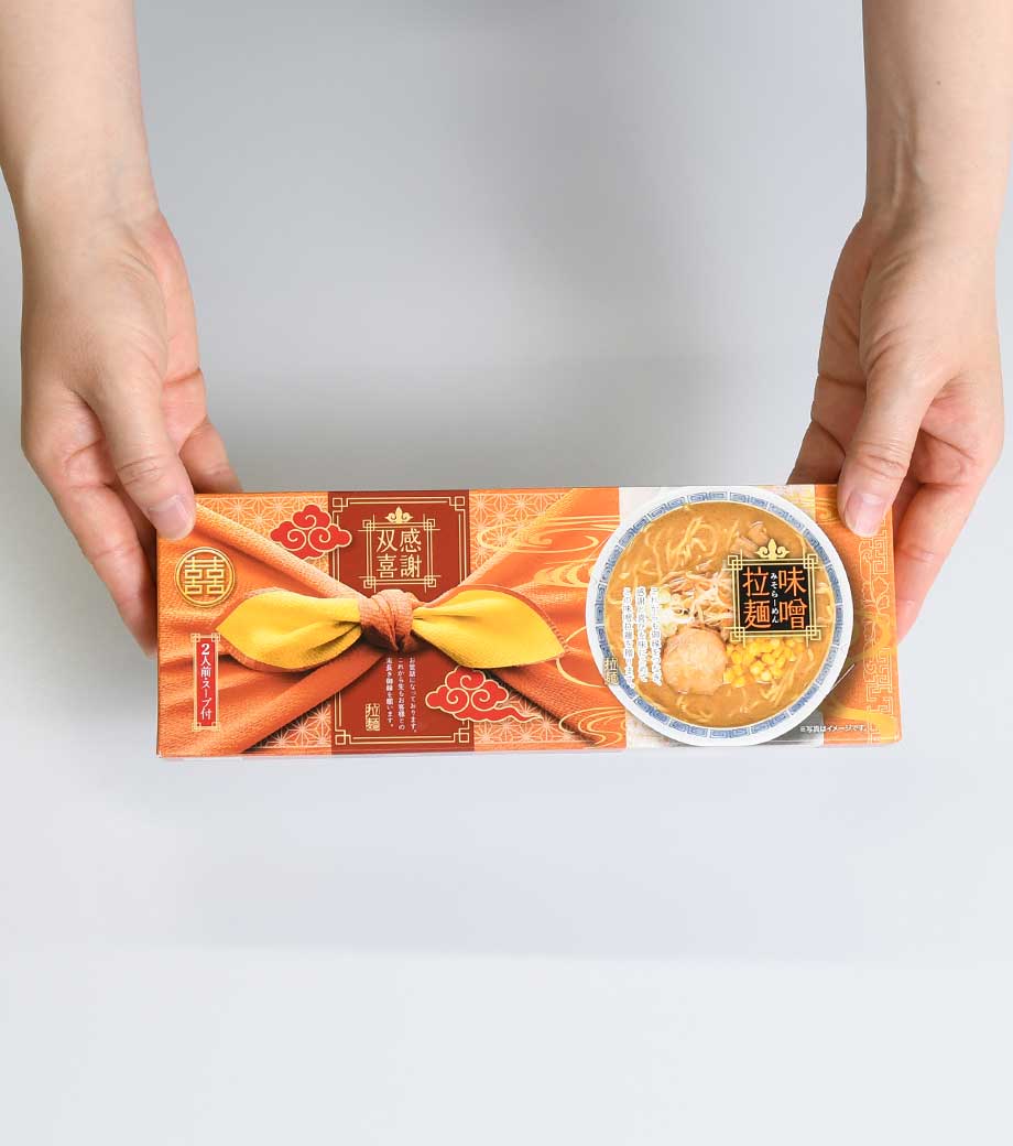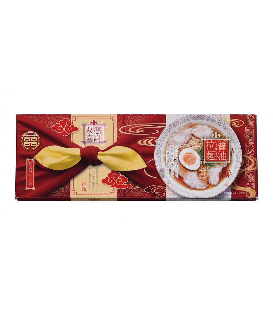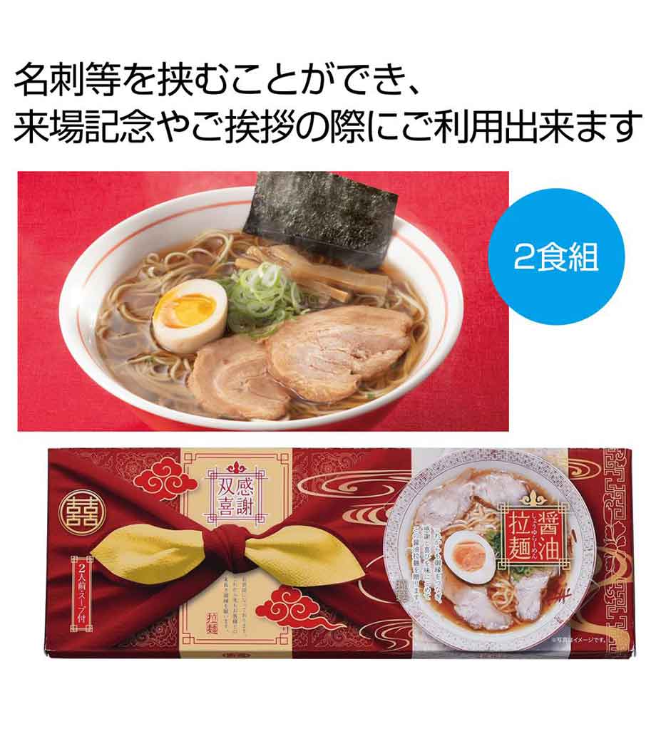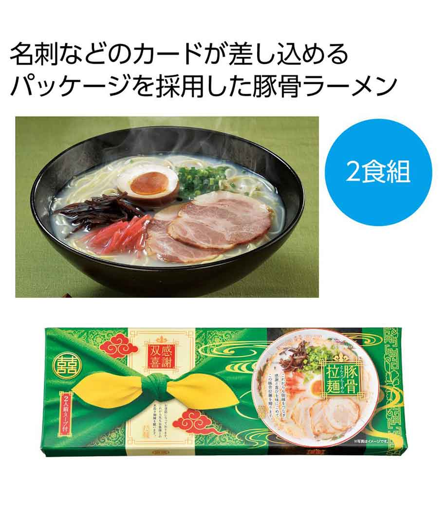 感謝双喜 ラーメン2食組 1箱(豚骨)はカードを差し込める仕様の化粧箱。名刺やショップカードと一緒に挨拶品や御礼品としてお渡しできます。風呂敷に包まれたプリントパッケージは感謝の気持ちをより一層伝えられます。化粧箱に書かれた「感謝双喜」の双喜は「感謝と共に、二重の喜び(慶事)が訪れることを願っています」という意味です。