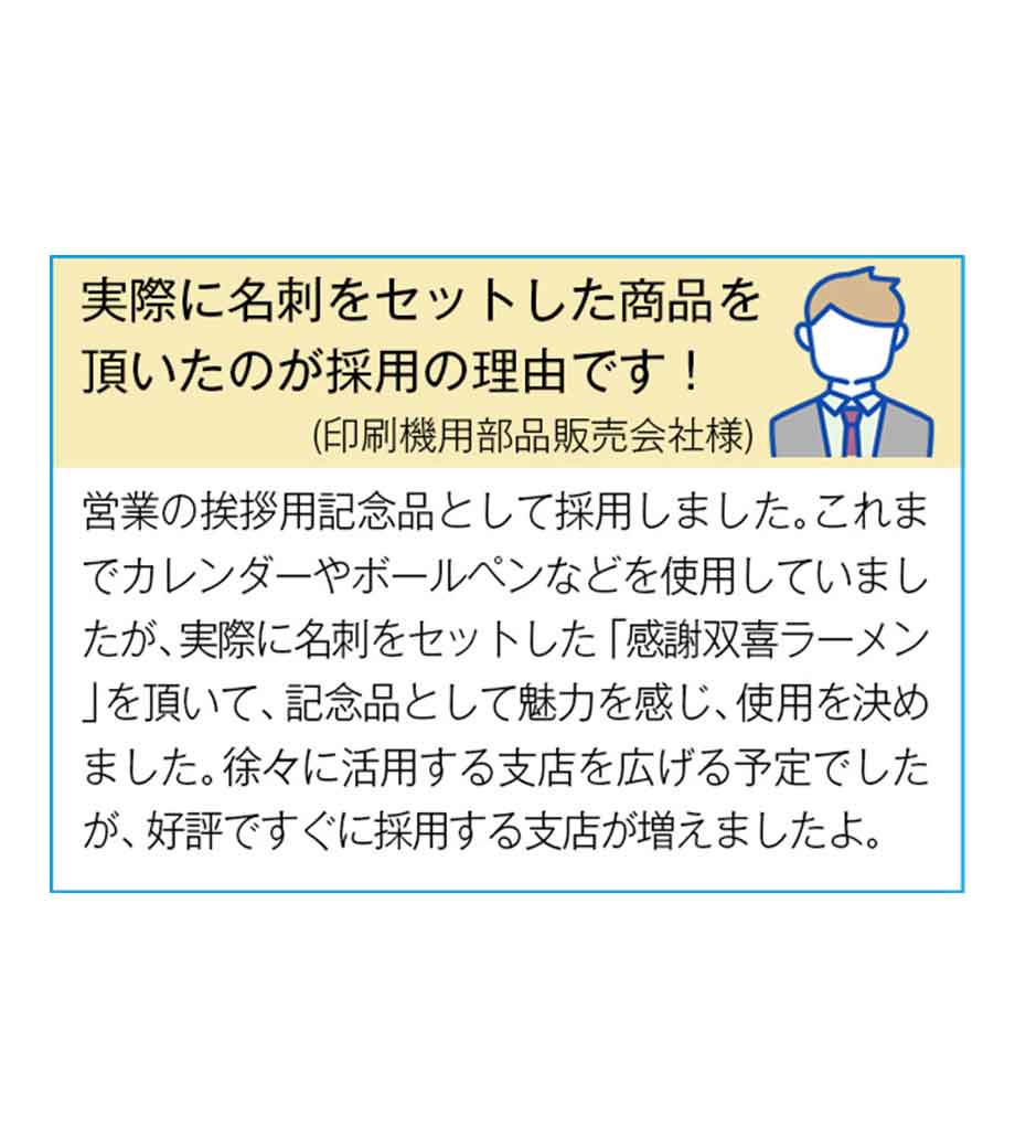 しっかりとしたコシが楽しめる乾麺タイプの棒ラーメンは年代問わず好まれる品。営業ツールとして多くのお客様に喜ばれますよ。