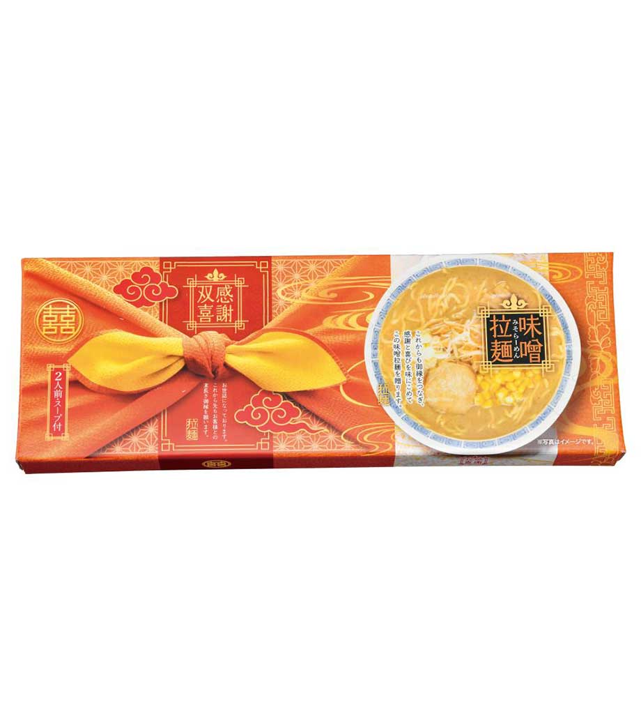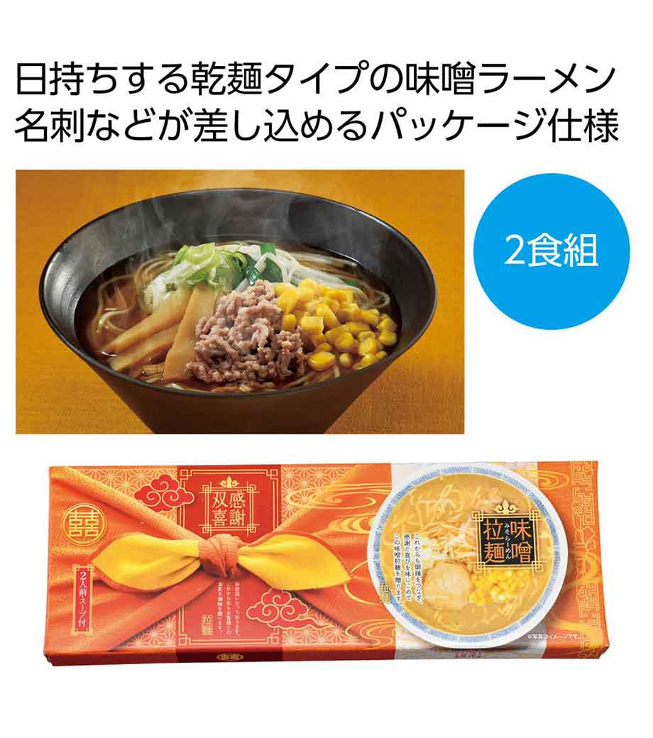 感謝双喜 ラーメン2食組 1箱(味噌)はありがとうの気持ちを伝える贈り物に最適です。乾麺タイプの棒ラーメンにコクのある濃厚味噌スープが絡みます。