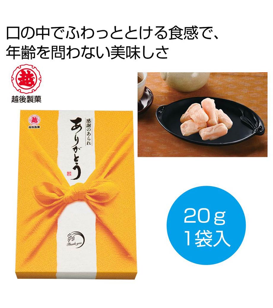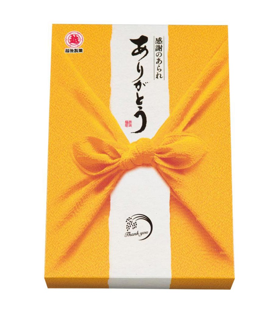 風呂敷包みが印刷されたパッケージに「ありがとう」の感謝の気持ちが添えられたお菓子ギフト。切り餅で有名な越後製菓の商品です。材料には国内産のもち米を使用したエビ塩味のあられせんべいが4袋入っています。口の中でふわっととける食感がクセになりますよ。