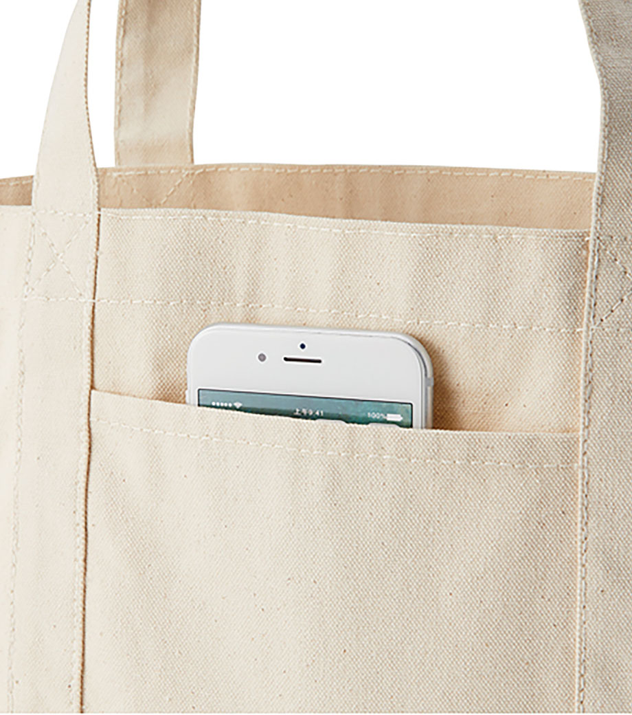 A6サイズのメモやスマホが入る大きめのポケットが2つ付いた便利なトートバッグです。生地は厚めの約10オンス。マチ付きでA4サイズがすっぽり入るサイズです。丁寧な縫製でつくりもしっかりしているので、高見えするノベルティを作成できます。