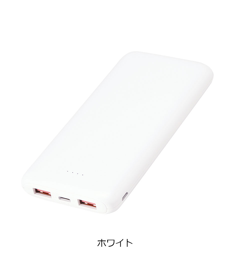 モバイルチャージャー10000 フラット/PSEマーク付は残量のデジタル表示機能付きです。USBポートが2口ついているのでスマートフォンを2台同時充電可能。Type-C対応の大容量チャージャーです。スタイリッシュな本体色で、ホワイトとブラックの2色から好きな色を選べます。