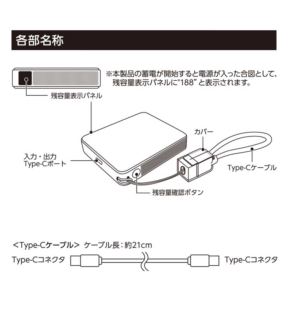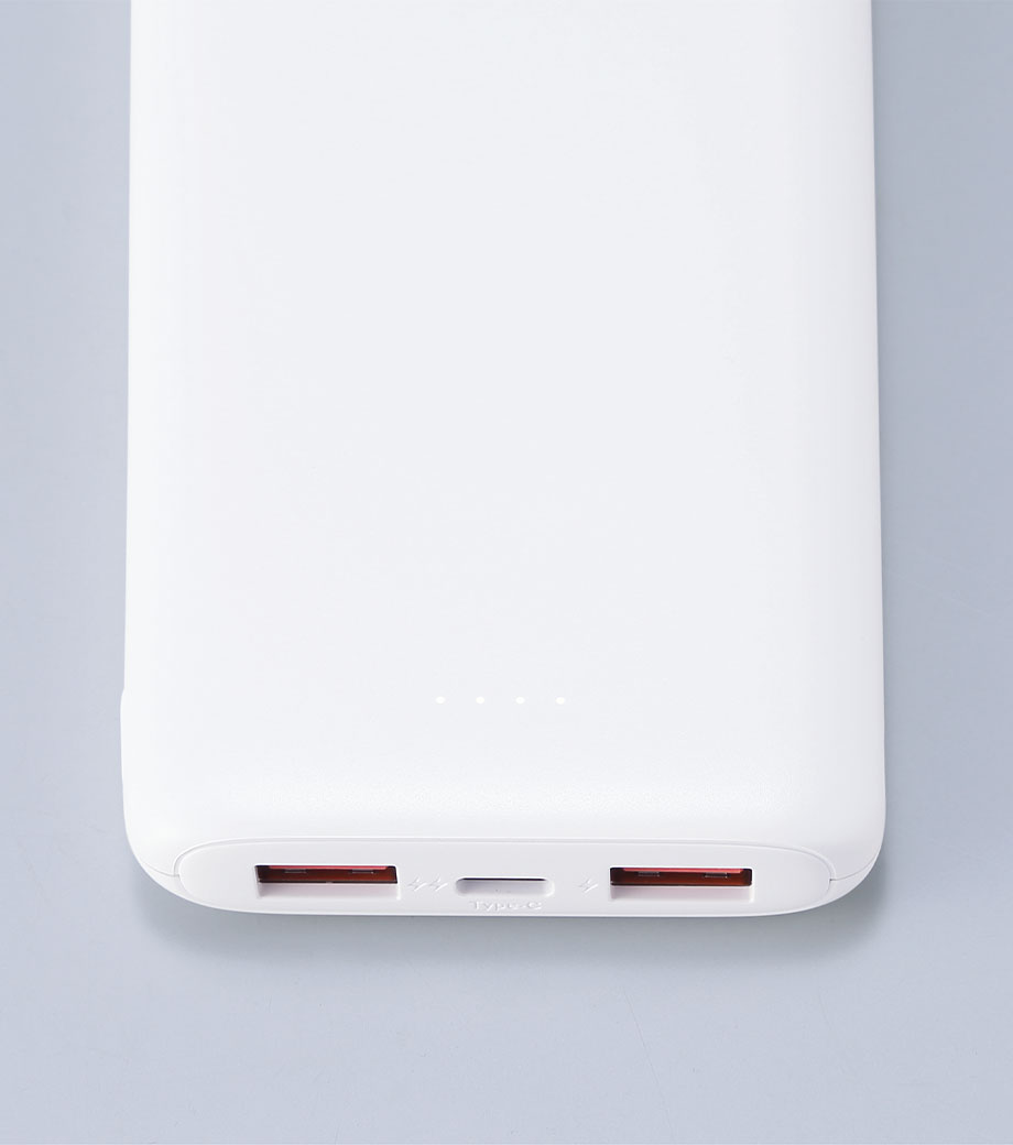 外出先でも安心の大容量10000mAh。便利なType-C-USBケーブル付きで、スマートフォンの充電にもすぐに対応できます。電源ボタンを押すと側面にバッテリー残量が数値で表示され、LEDライトの光でスタイリッシュに浮かび上がります。ひと目で残量が確認できる便利な仕様です。
