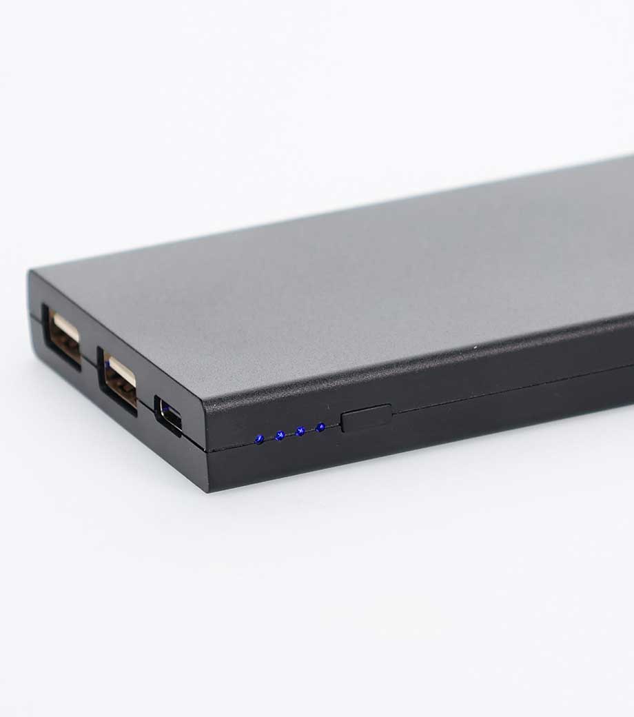 手のひらサイズの約110gと軽量でコンパクトなモバイルチャージャー。PSEマーク付で使用も安心です。出力用USBポートを2口搭載し、2台同時の充電が可能。側面の残量表示LEDライトでバッテリー残量も一目で確認できます。バッグやポケットにもすっきり収まり、旅行や外出先での携帯に最適です。