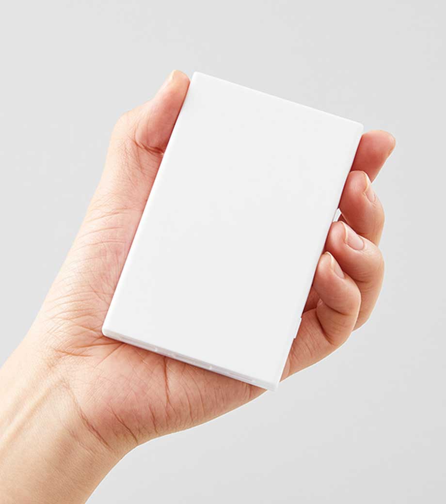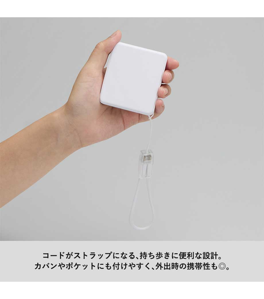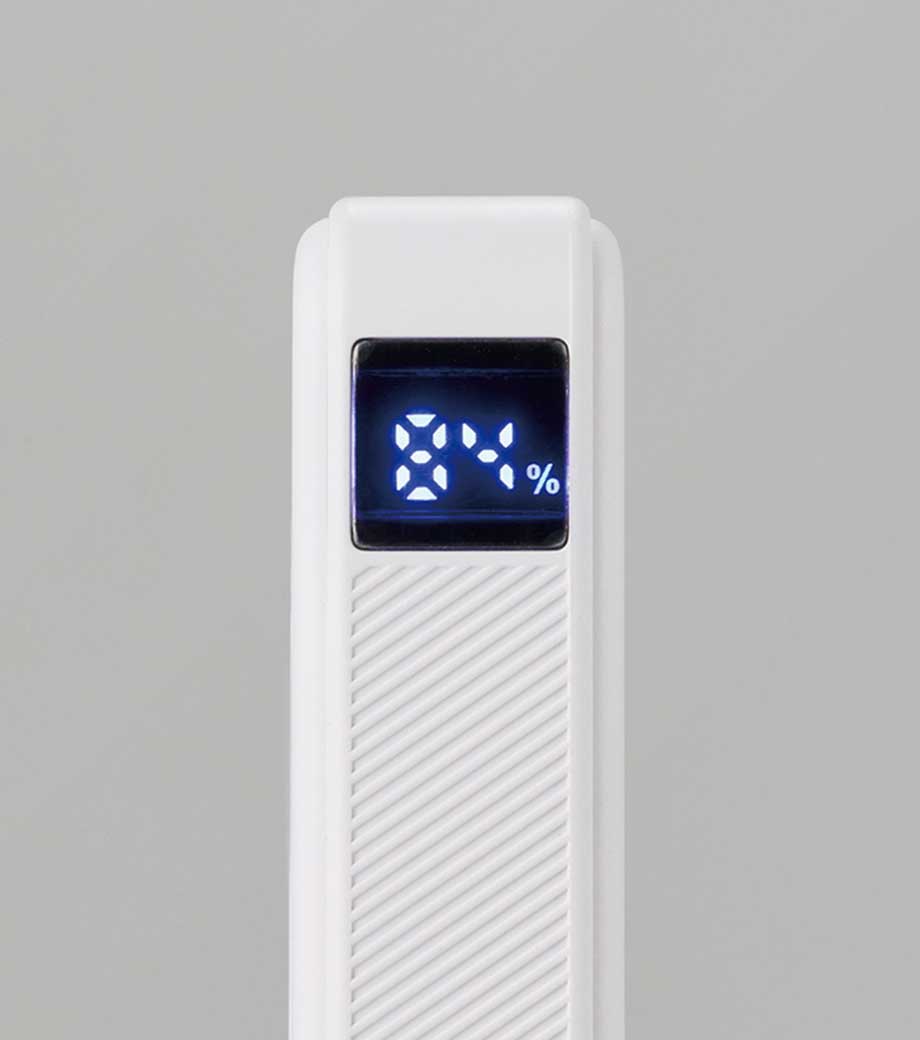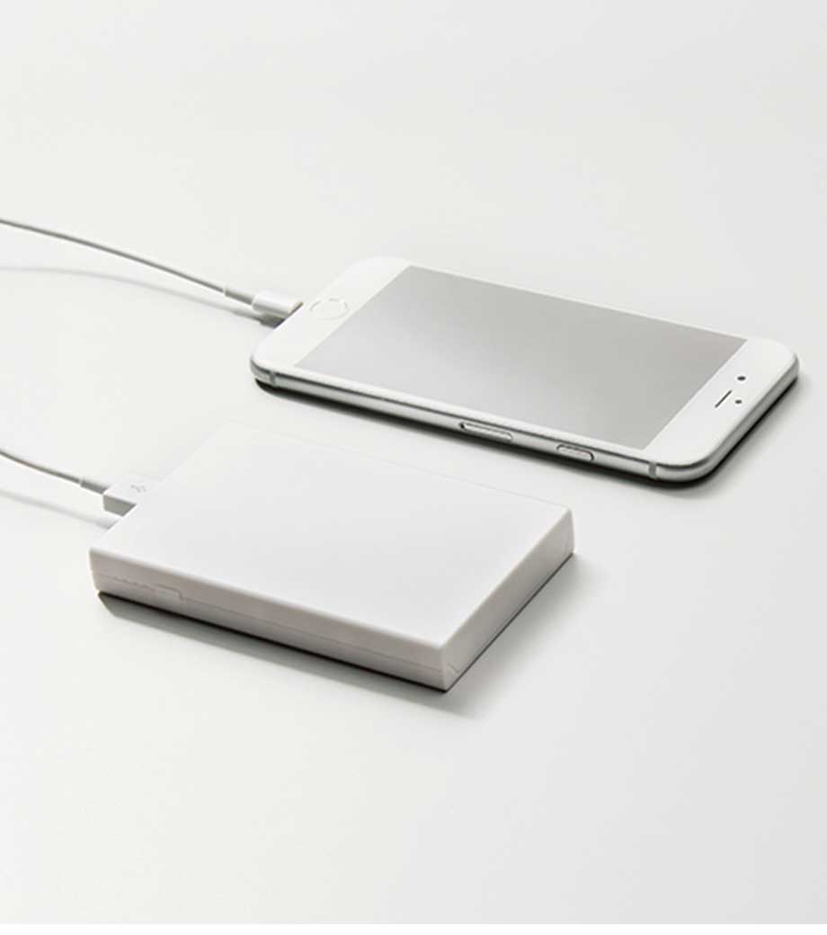 スマホ程のサイズ感で約9mmの薄さはかさ張らず持ち運びやすく約77gと軽量。インジケーターの4つのランプが充電状態をお知らせしてくれます。マットな質感と清潔感ある白は使う人を選びません。