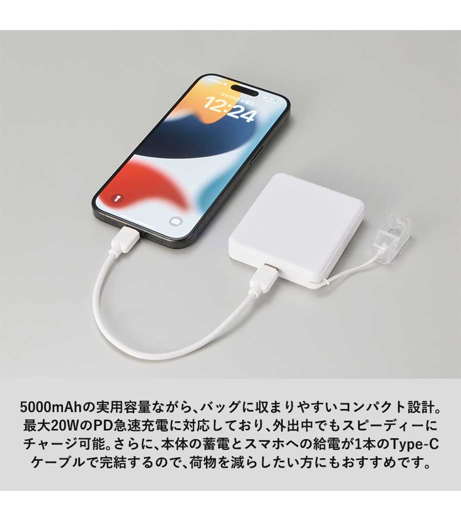 厚みわずか約13mm!世界最小クラスの急速充電対応モバイルバッテリーです。5000mAhながらも卵2個分ほどの軽さ。出力はType-Cが1ポート、Type-Aが2ポートあり3台同時充電可能。スマホ・イヤフォン・電子タバコなど複数の機器にお使いいただけます。高性能ICチップ搭載で、安心の過蓄電・過放電保護回路仕様。