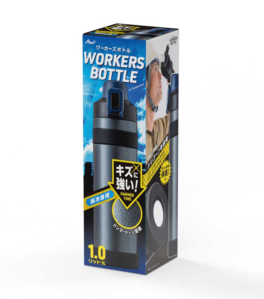 ワーカーズボトル 1000mlは、保冷専用の真空2重構造ボトルです。ざらざらとしたハンマートーン塗装加工で、キズや汚れが目立ちにくいのが特徴。底面にシリコーンカバーが付いているため、落下時の衝撃を吸収しキズが付くのを軽減します。飲む時には胴部のシリコーンが滑り止めになるので、手袋をはめた手でも滑りにくく飲みやすいです。野外スポーツや、屋外で作業される方におすすめしたいボトルです。