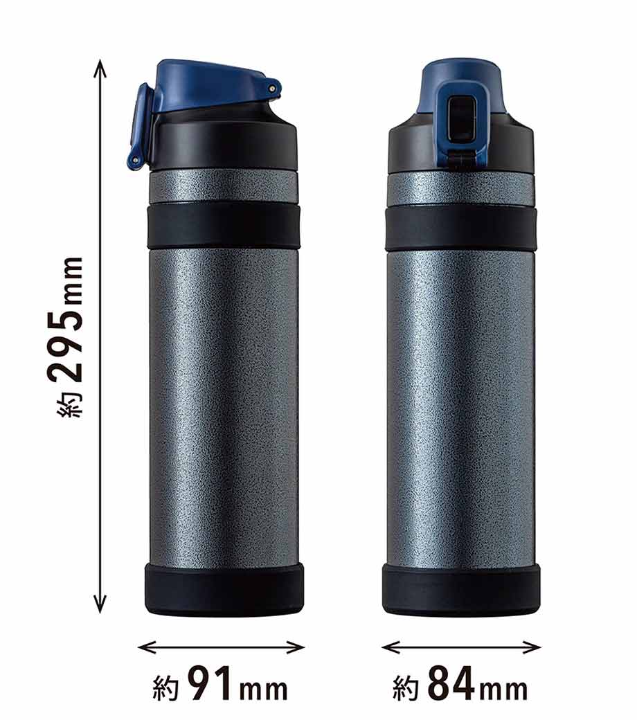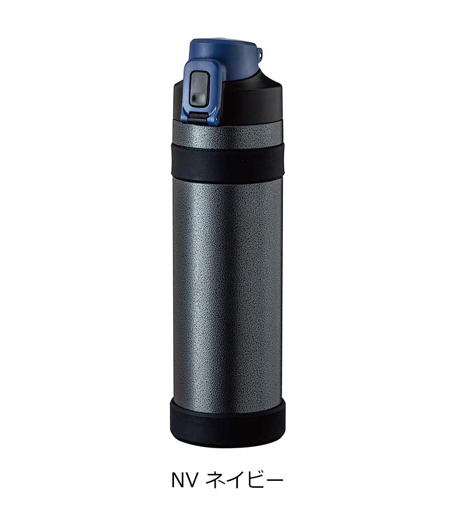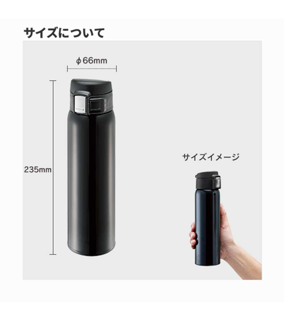 ワンプッシュで手軽に水分補給できる、真空構造の保冷温ステンレスボトルです。容量はペットボトル1本分の約500mlで、通勤・通学からスポーツシーンまで幅広く使えます。誤ってフタが開くのを防ぐスライドロック付きです。広口で氷を入れやすく、冷たい飲み物の温度も長時間キープ。底面にはすべり止めが付いており、デスクでも安定して置けます。