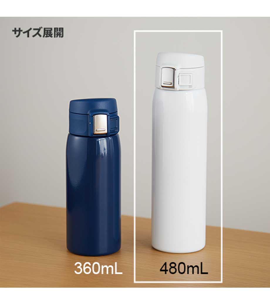 真空2重構造で保冷温効果もばっちり。たっぷり飲める480ml容量で街歩きやショッピングなどのおでかけはもちろん、スポーツシーンやドライブにもおすすめです。