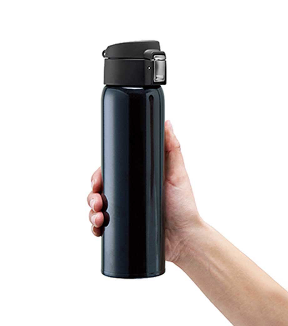 保冷温性バツグンの真空二重構造ボトルです。500mlの大容量ですが約185g程度と軽量。携帯しやすく外出先や運動中の水分補給に便利です。フタは片手で楽々開閉できるワンタッチオープン式。フタにロックが付いているので、バッグの中でこぼれる心配はありません。