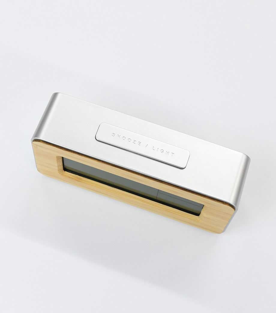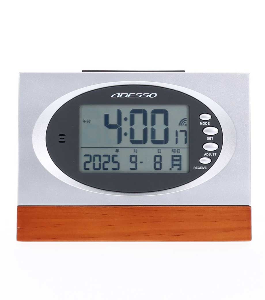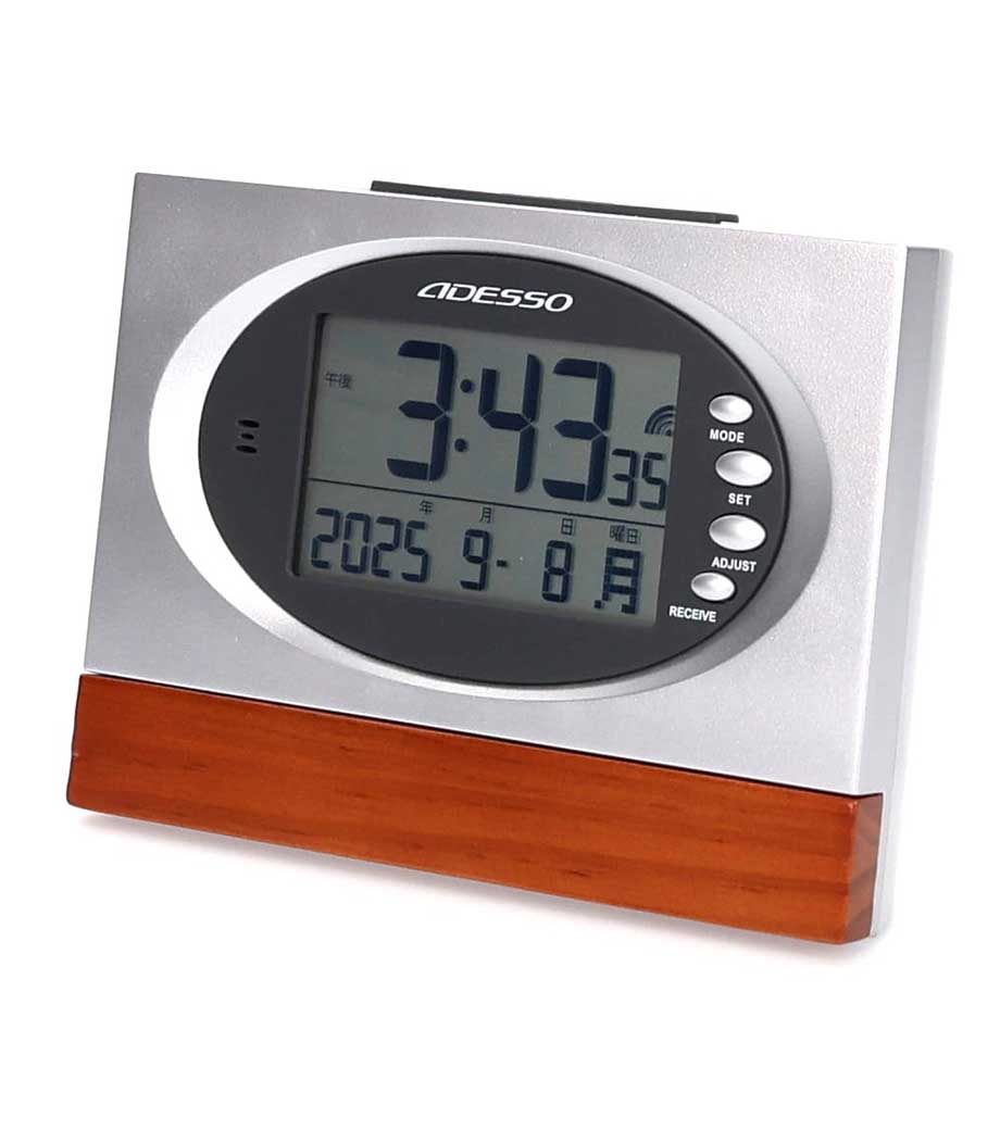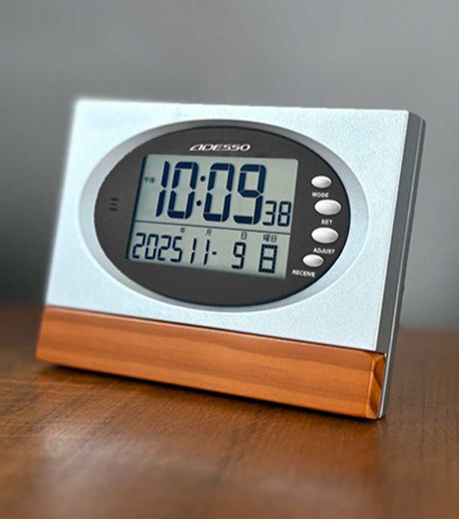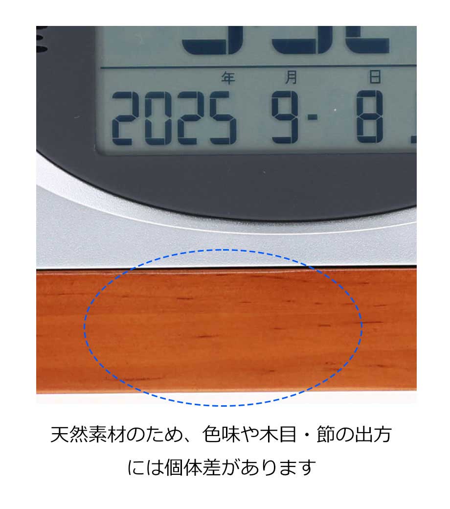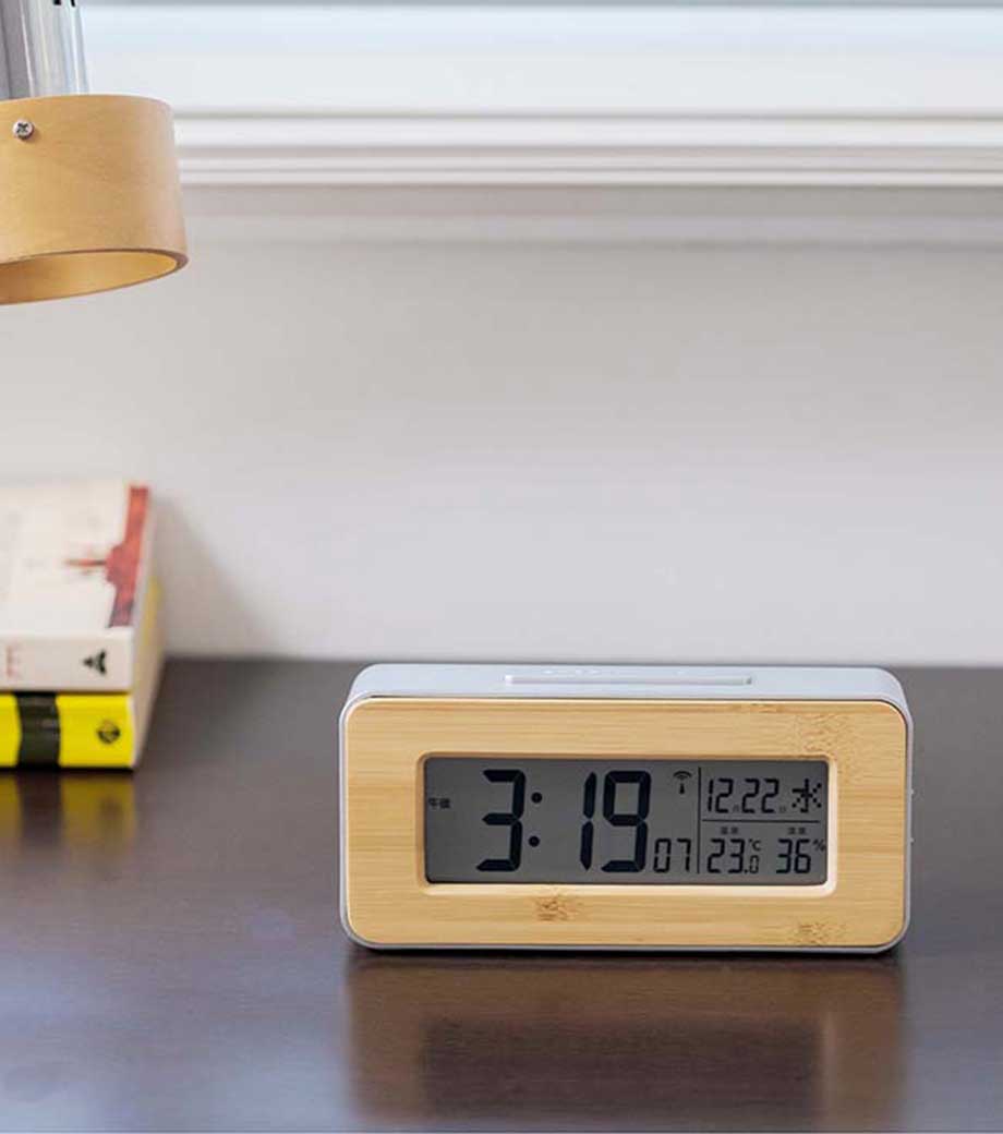 手動設定不要な手間いらずの電波時計です。デジタル表示ながら、天然木のナチュラルな風合いで落ち着いた印象に。大きな液晶表示だから時刻・日付・曜日がひと目で確認できます。目覚まし+スヌーズ機能を搭載し、前面ボタンで直感的に操作できるのも嬉しいポイント。