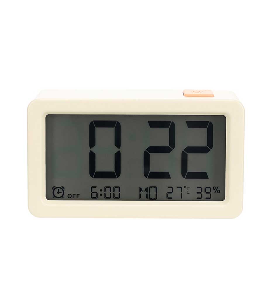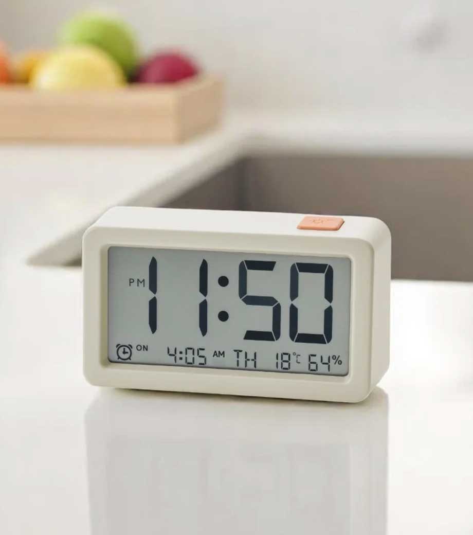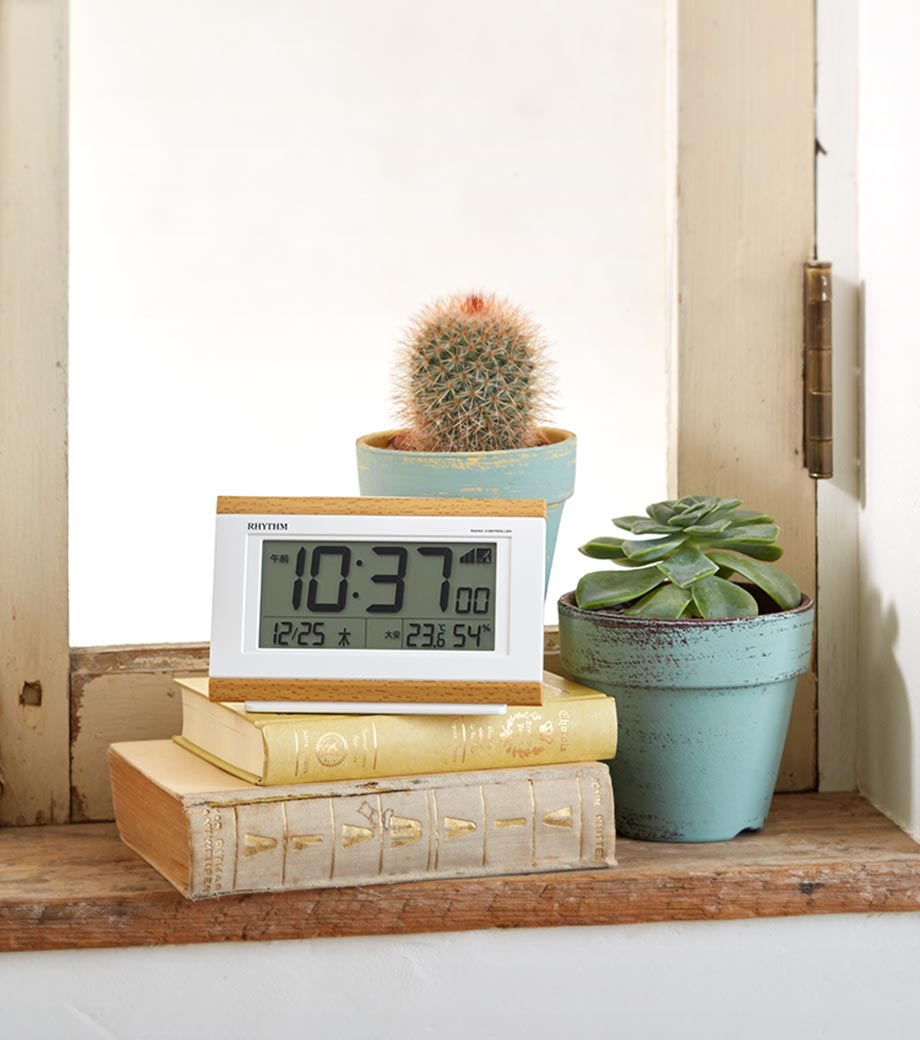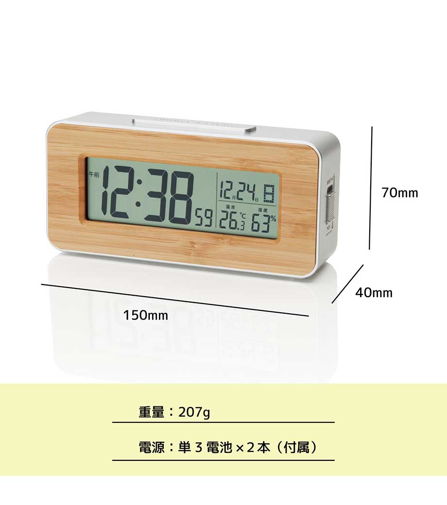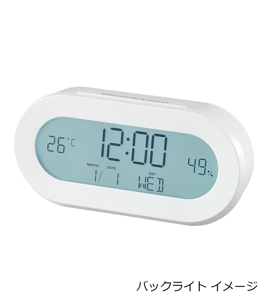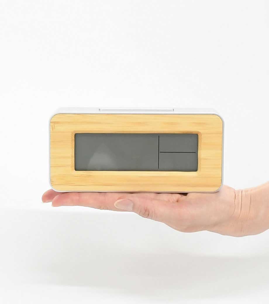 大きな液晶画面で時間がはっきり見える、デジタル表示の時計です。コンパクトなサイズで置き場所を選ばず、ナチュラルなカラーがインテリアに自然と馴染みます。アラーム機能に加え、寝坊防止に便利なスヌーズ機能も搭載。温度と湿度の表示機能付きで、室内の環境管理や熱中症対策にも役立ちます。