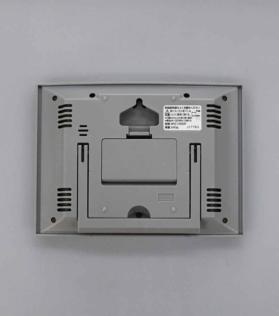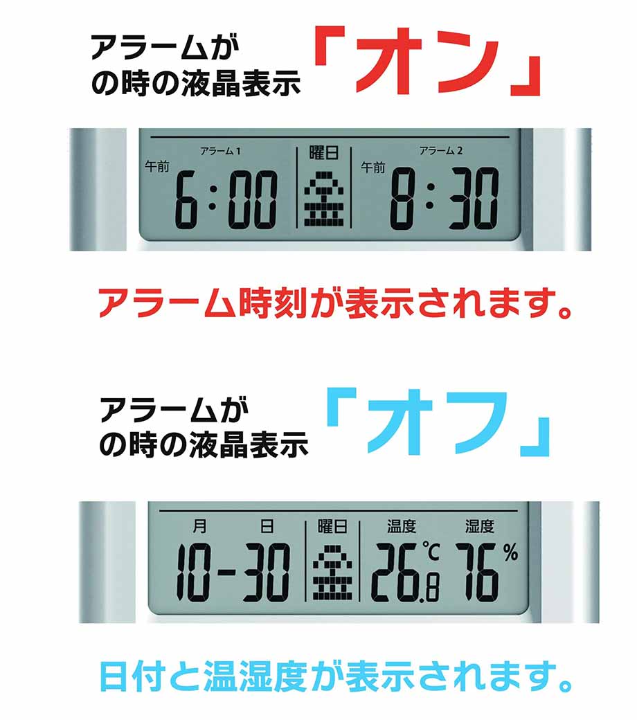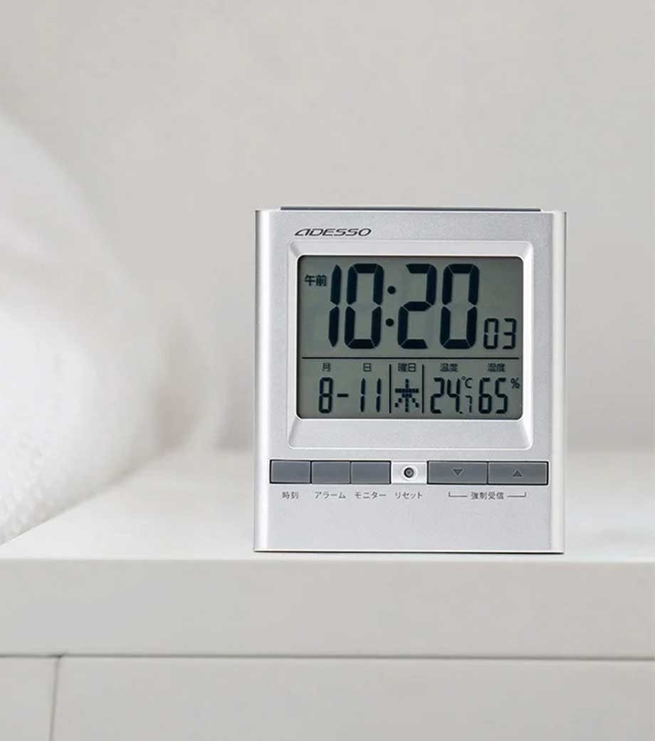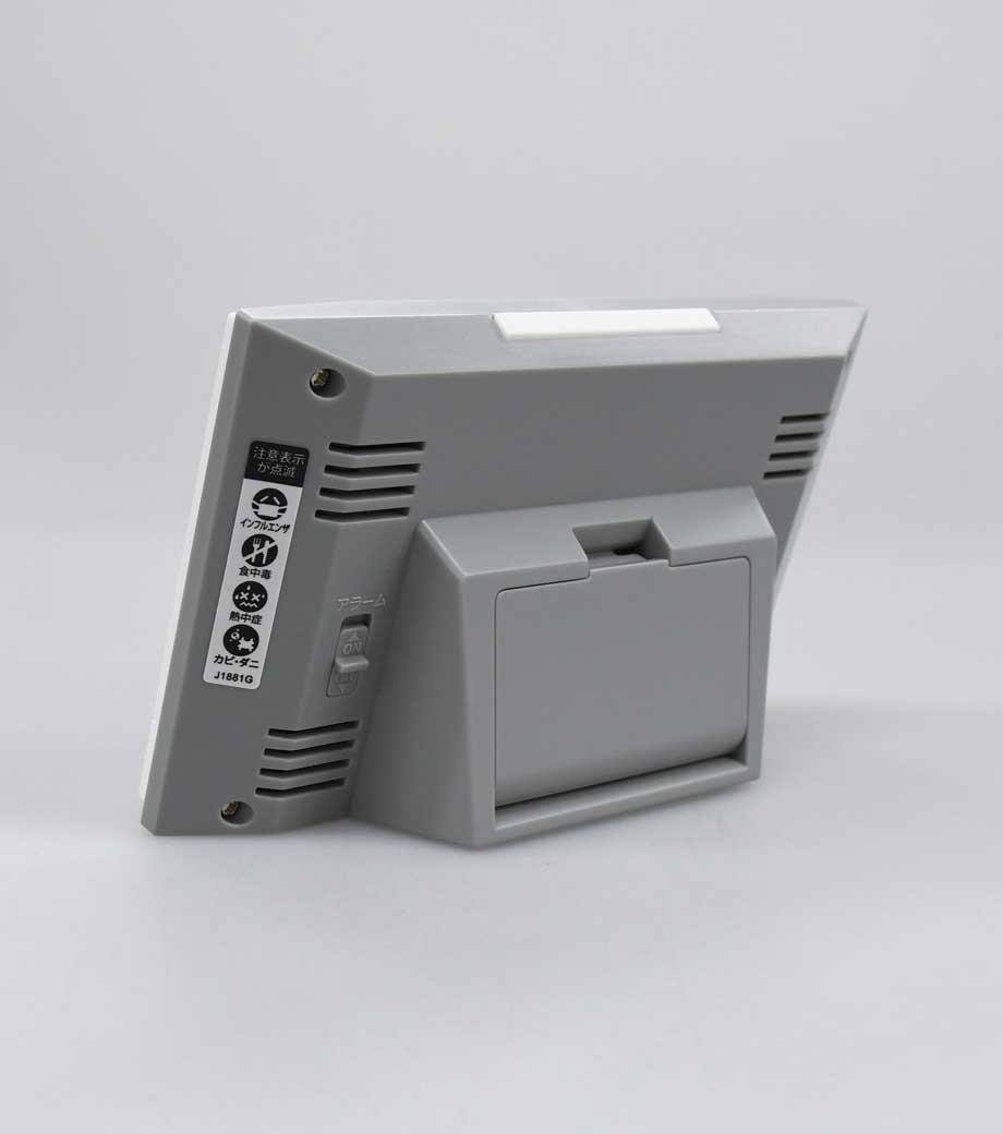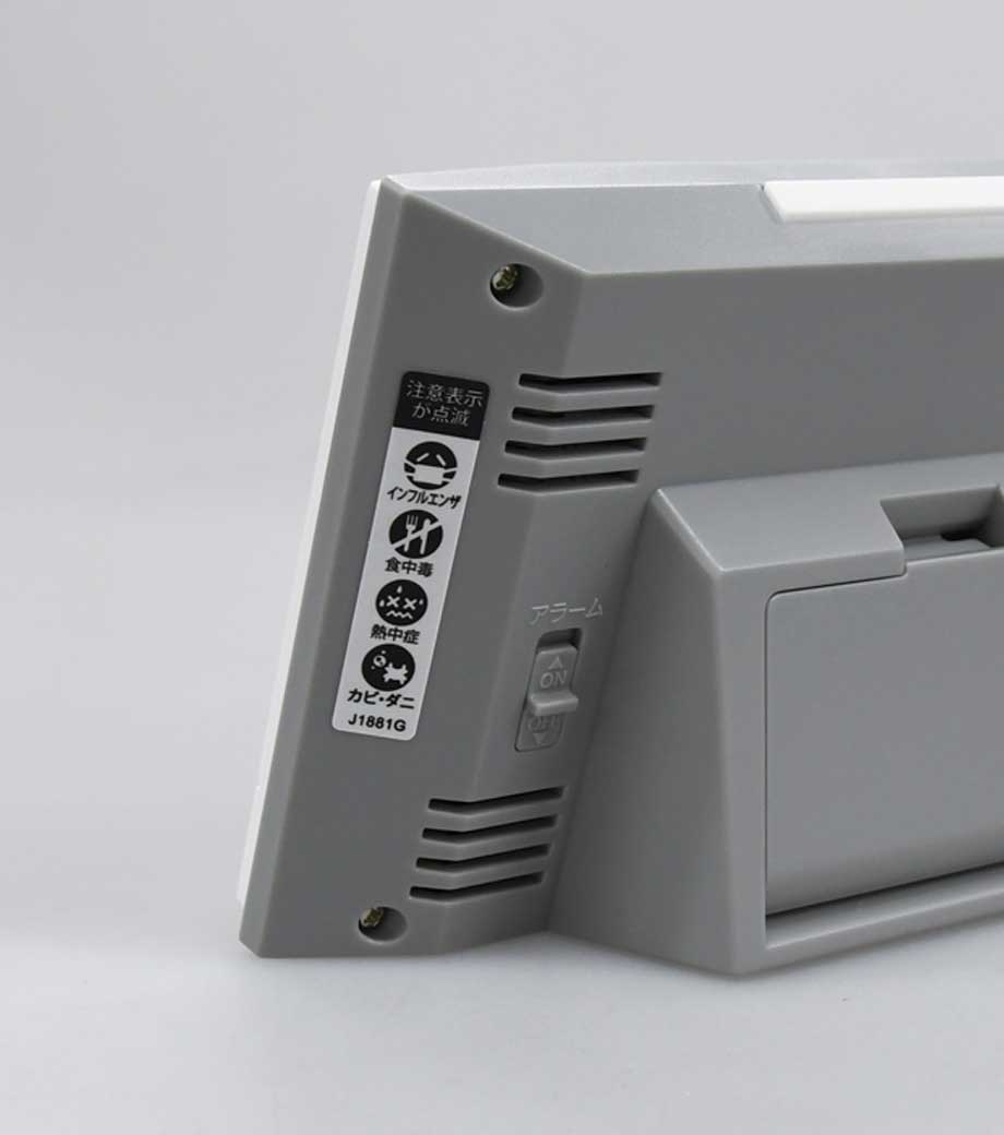 毎時00分に時刻をお知らせする時報機能付きです。アラームを設定すると時報機能は解除されるので目覚まし時計としても活躍。温度と湿度が表示されるので室内熱中症対策グッズとしても重宝します。