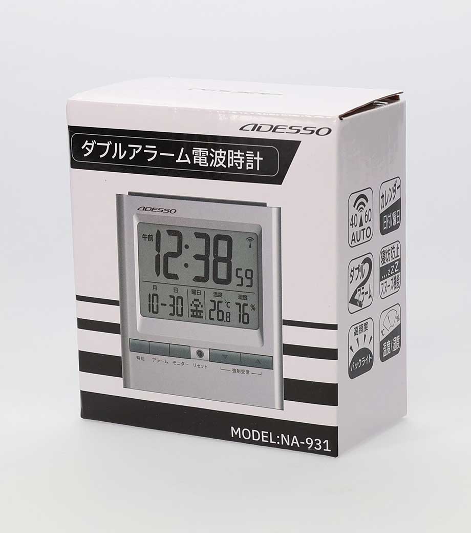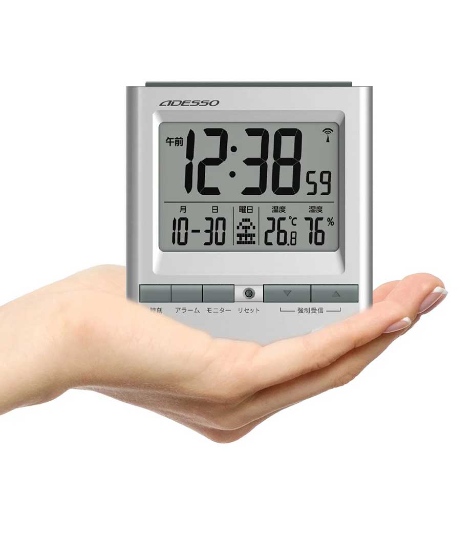 アラームを同時に2つ設定できる電波時計。ベッドサイドやデスクなどに置きやすい手のひらサイズです。時刻と一緒に日付・温湿度も確認できて便利。暗い部屋でも画面を確認できるバックライト機能付きです。スヌーズ機能も付いて寝坊防止にも。