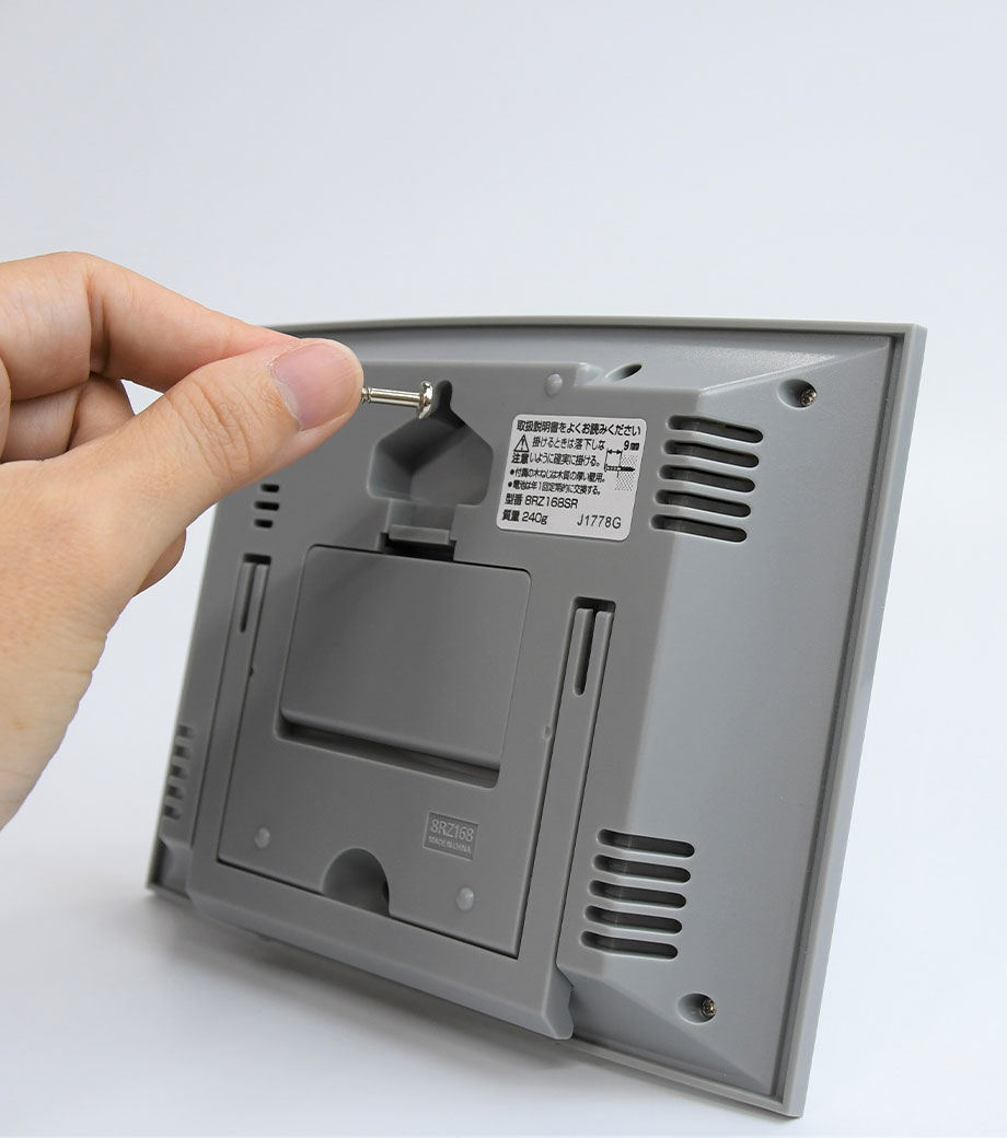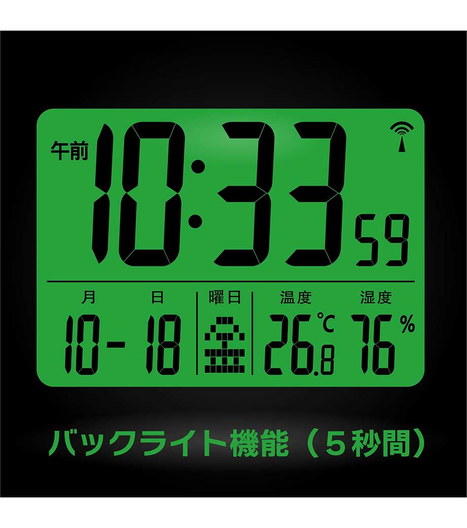セイコー 大画面電波デジタル目覚しは大きく見やすい時刻表示が嬉しいデジタル時計。背面に内蔵されたスタンドを使えば置時計に、付属のねじを取り付ければ掛け時計にもなる掛置兼用タイプです。時刻表示の下にはカレンダーと温湿度表示があり、お部屋と健康管理に役立ちます。寝室でのご使用に便利なアラーム・スヌーズ機能付き。アラーム音は「ダンダントーン」という徐々に音が速くなる電子音を採用しています。