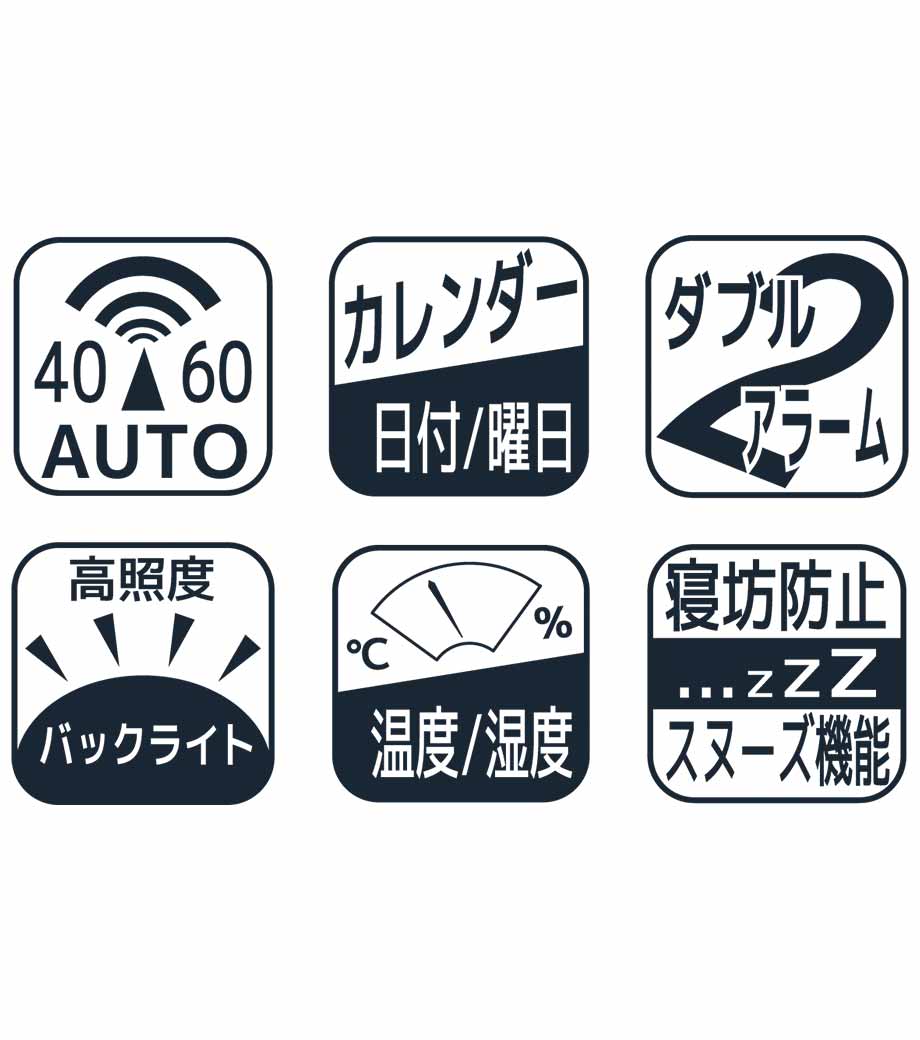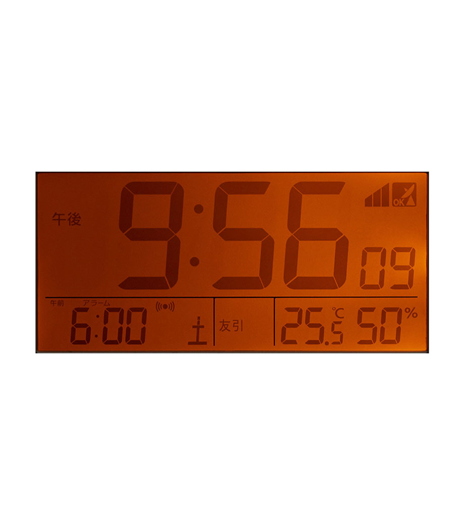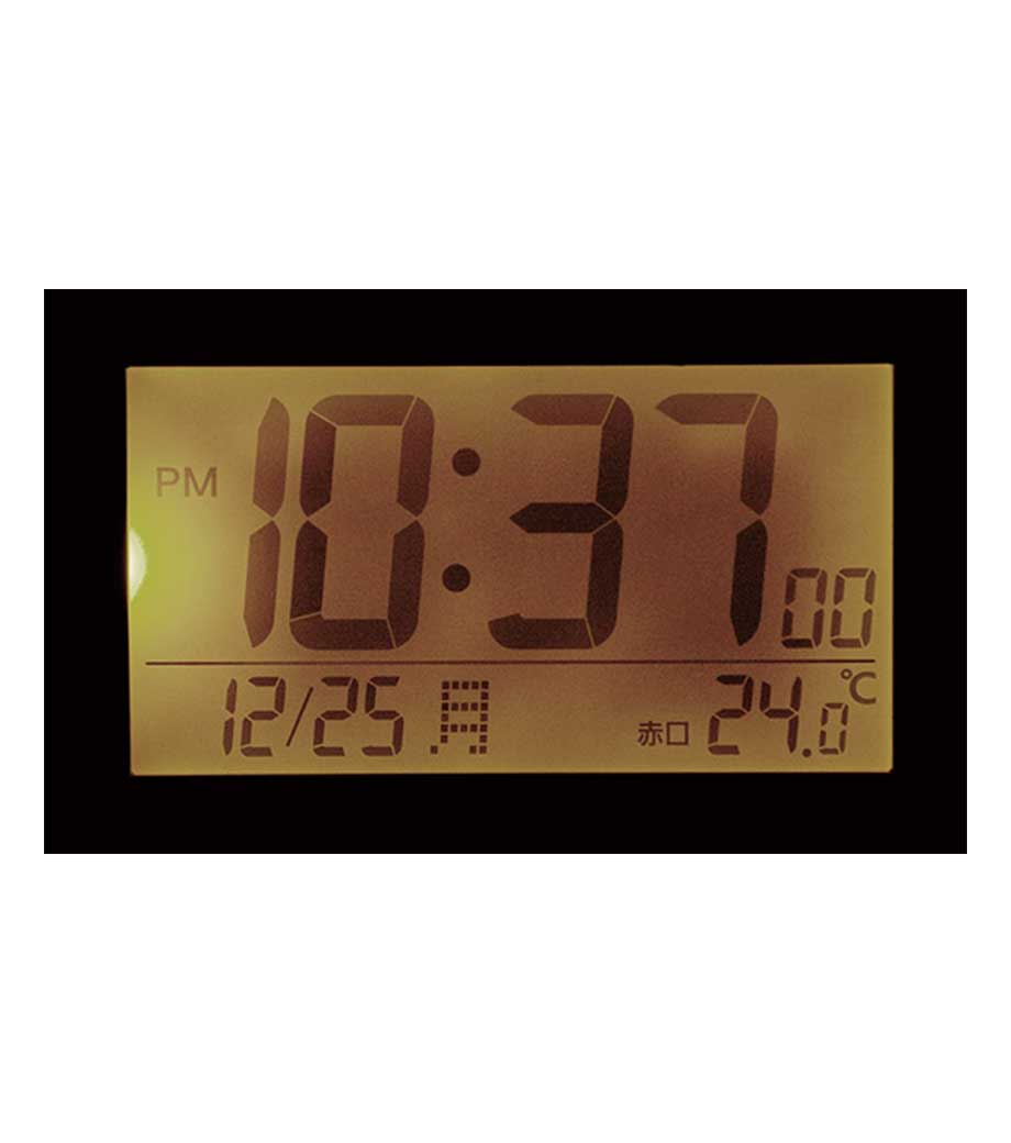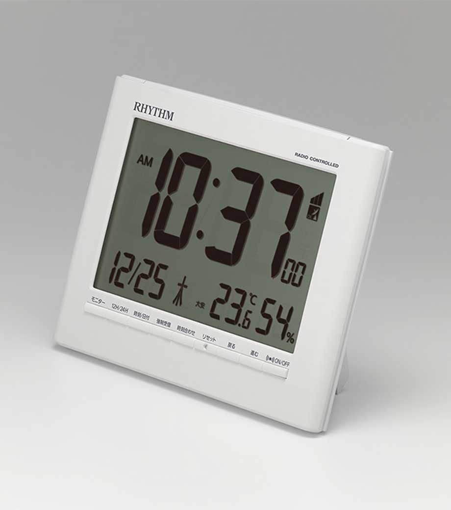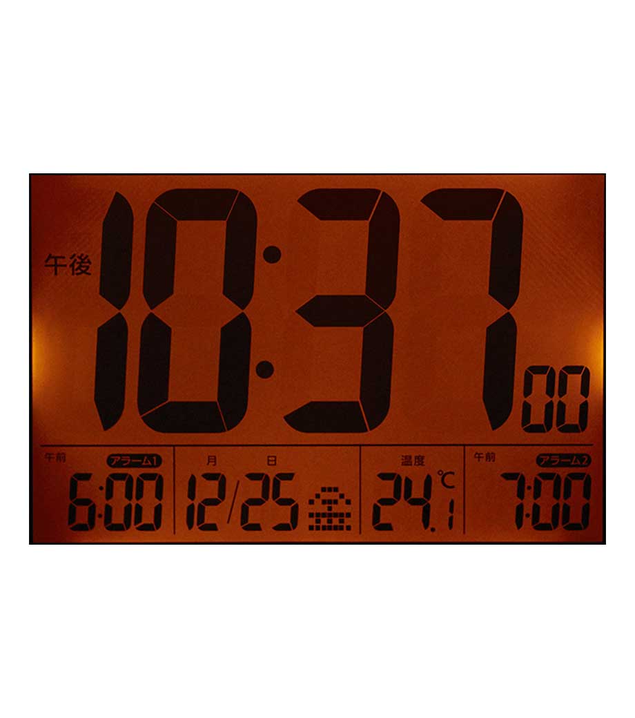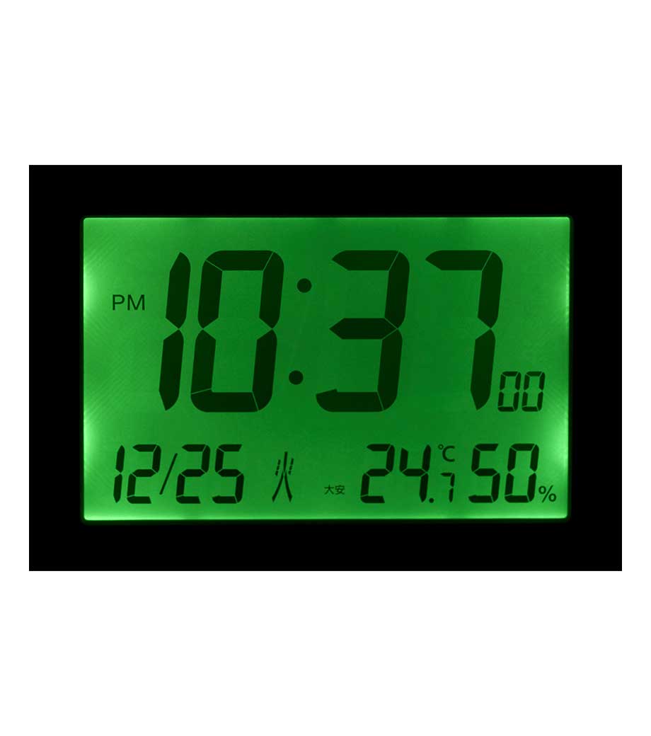 遠くからでも数値がわかりやすいビックサイズの文字表示で、時刻の表示はもちろん日付や曜日、温度がひと目でわかります。
