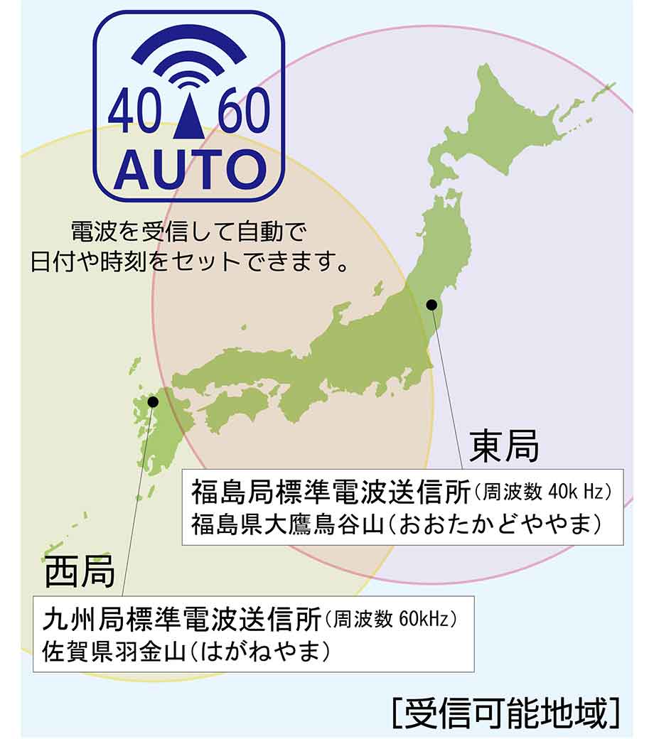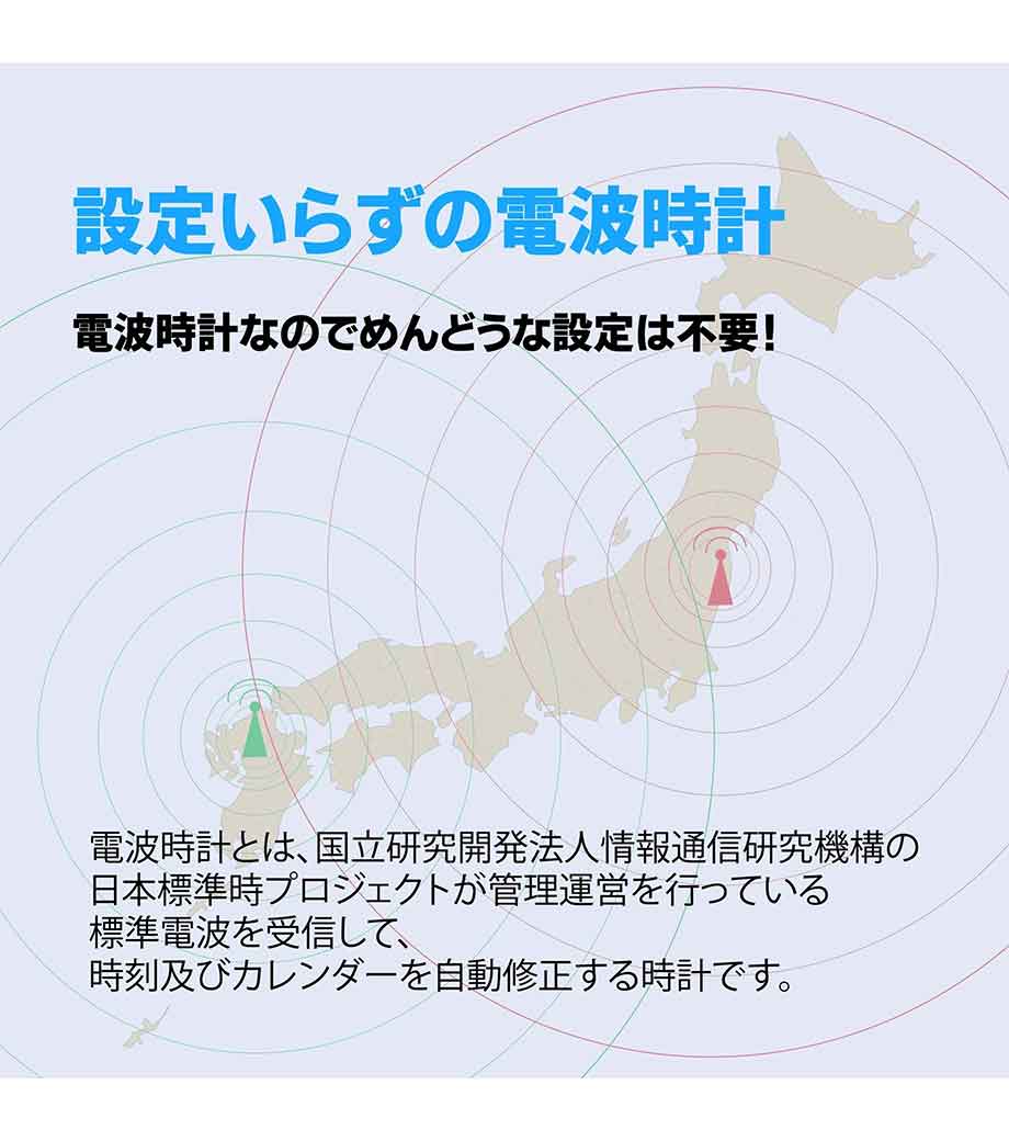 標準時刻電波の受信機能により、正確な時刻表示を常に維持。正常に電波を受信できる環境で、秒単位で正確な時刻を知ることができます。