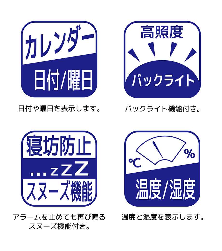 大きく見やすい表示が特徴の電波時計。時刻と一緒にカレンダーと温湿度が一目で確認できます。あたたかみのある木目調デザインでどんなインテリアにもマッチ。目覚まし時計は便利なスヌーズ機能付きで寝室での使用にも。置きでも壁掛けでもお使いいただけます。