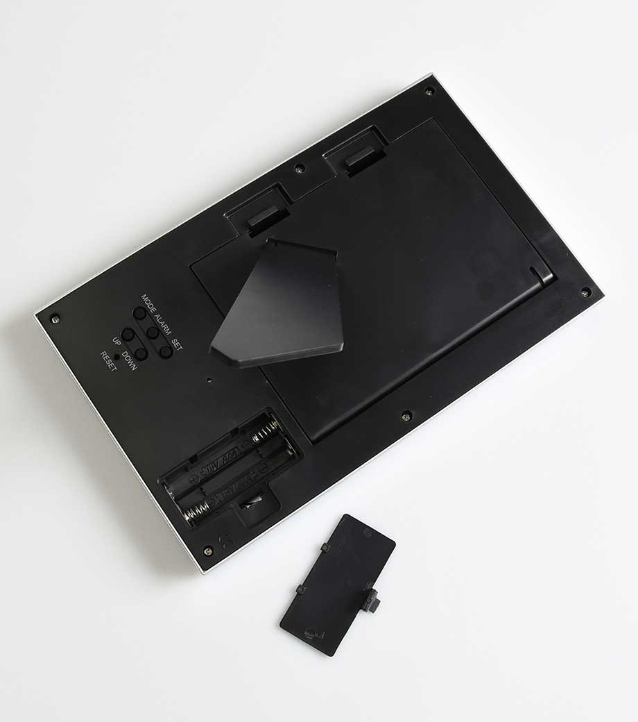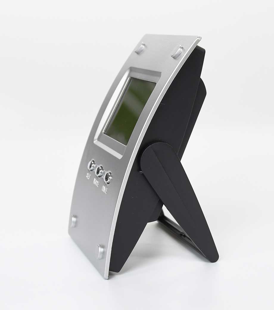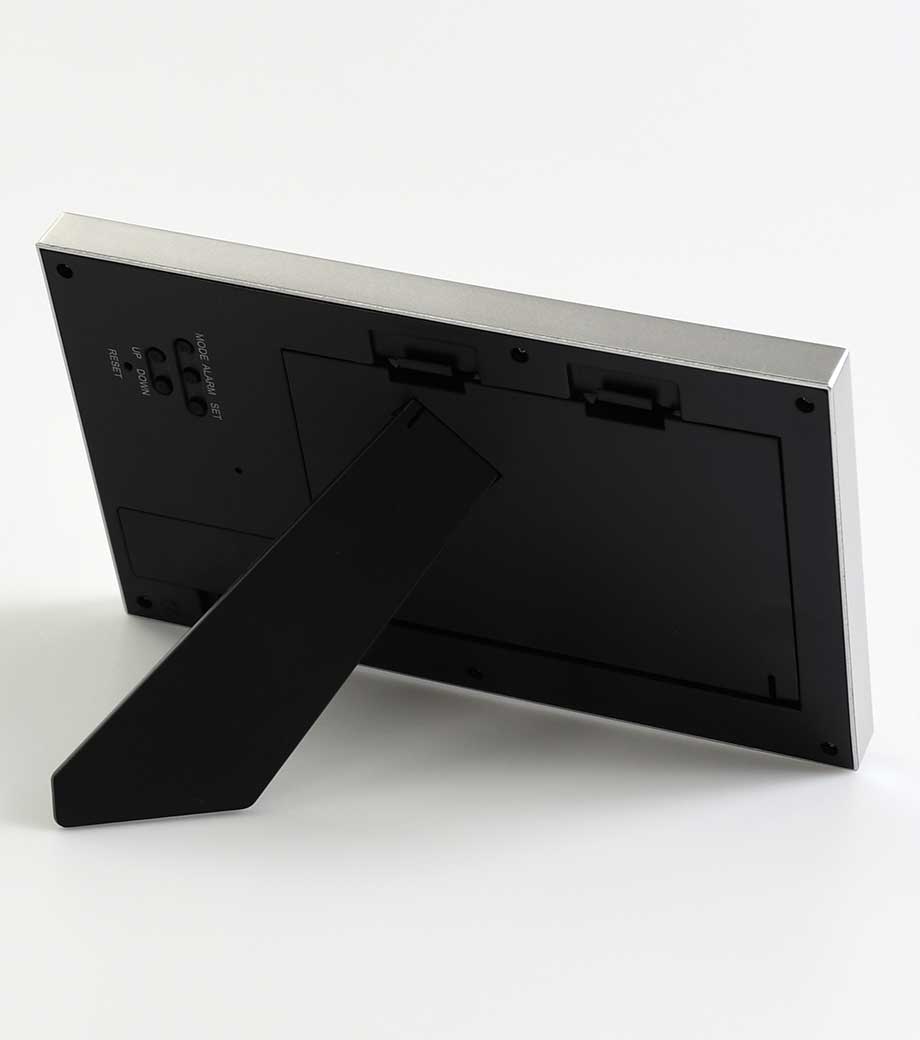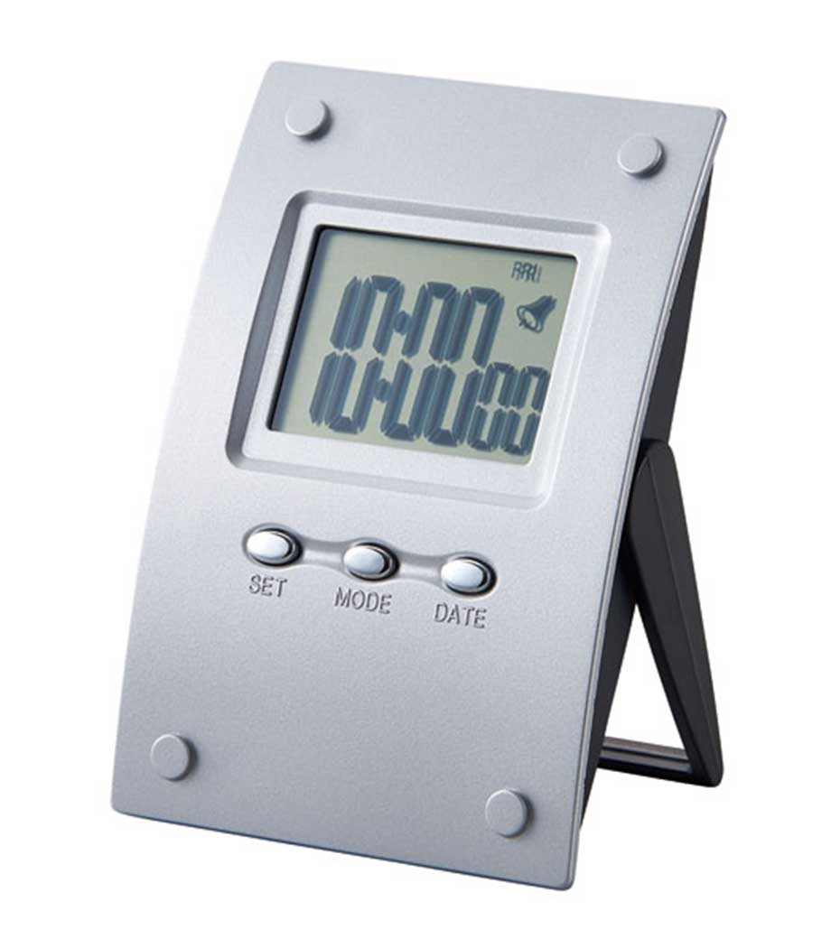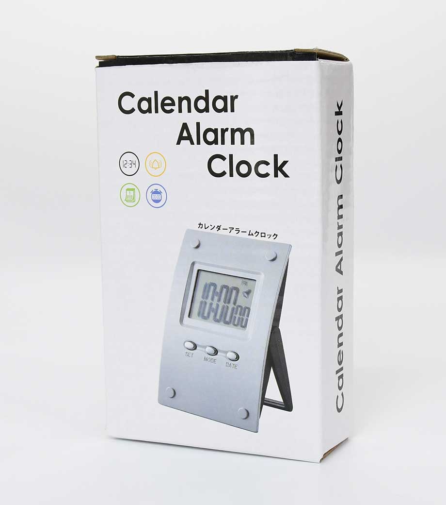 カレンダーアラームクロックはスタンド付きの小ぶりなデジタル時計。時計、アラーム、カレンダー、ストップウォッチ機能を備えた多機能タイプです。スマホほどのサイズでオフィステーブルやベッドサイドなどにさり気なく置いておけます。シャープでモダンなデザインはどんなインテリアでも使い易いですよ。