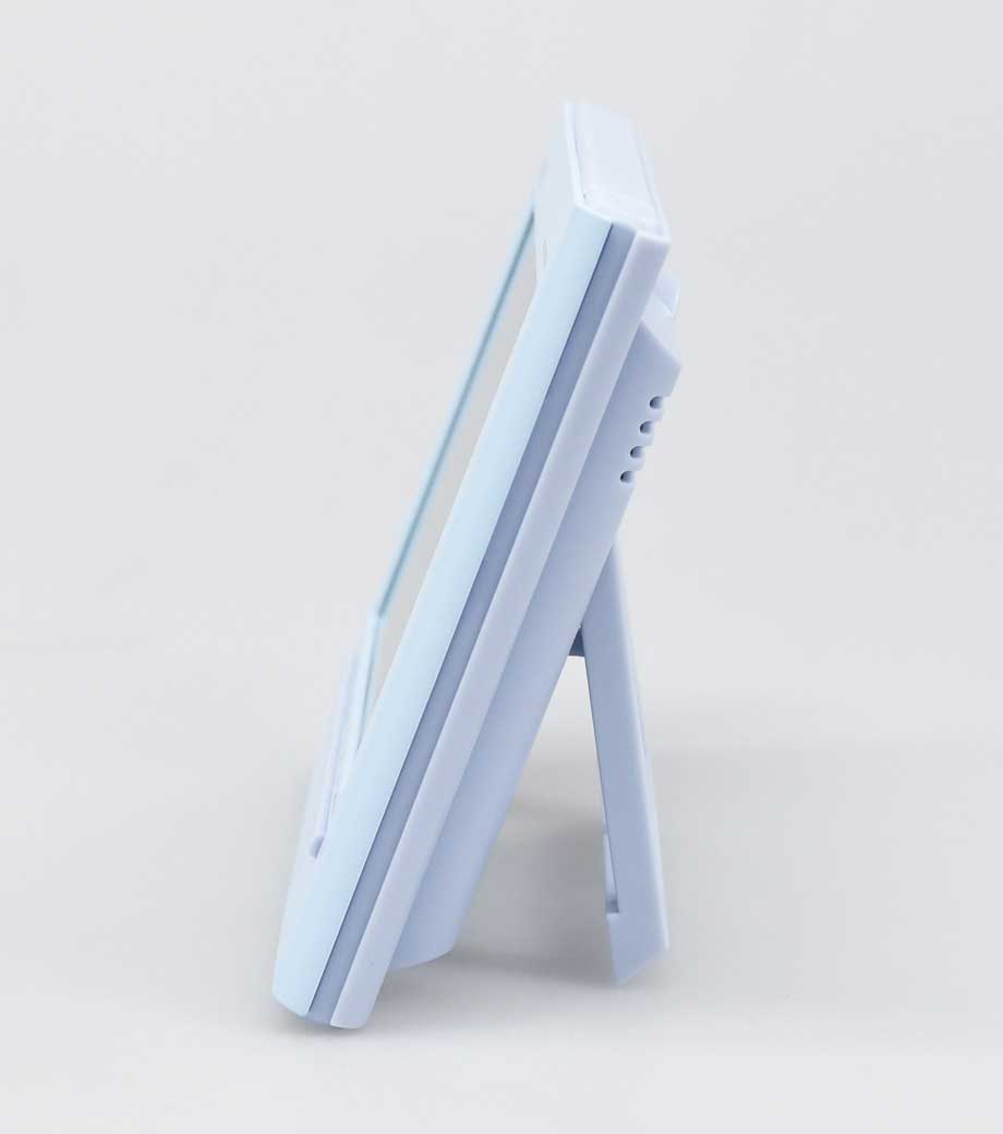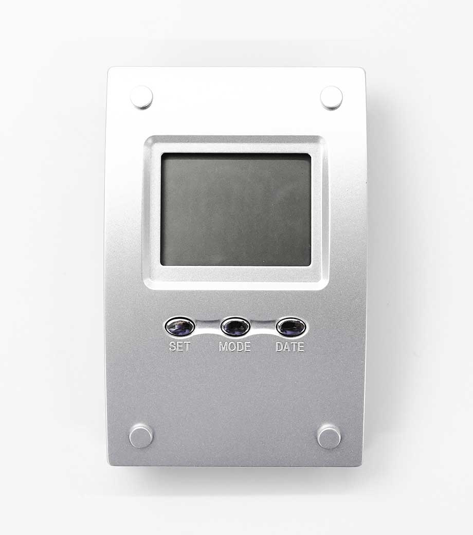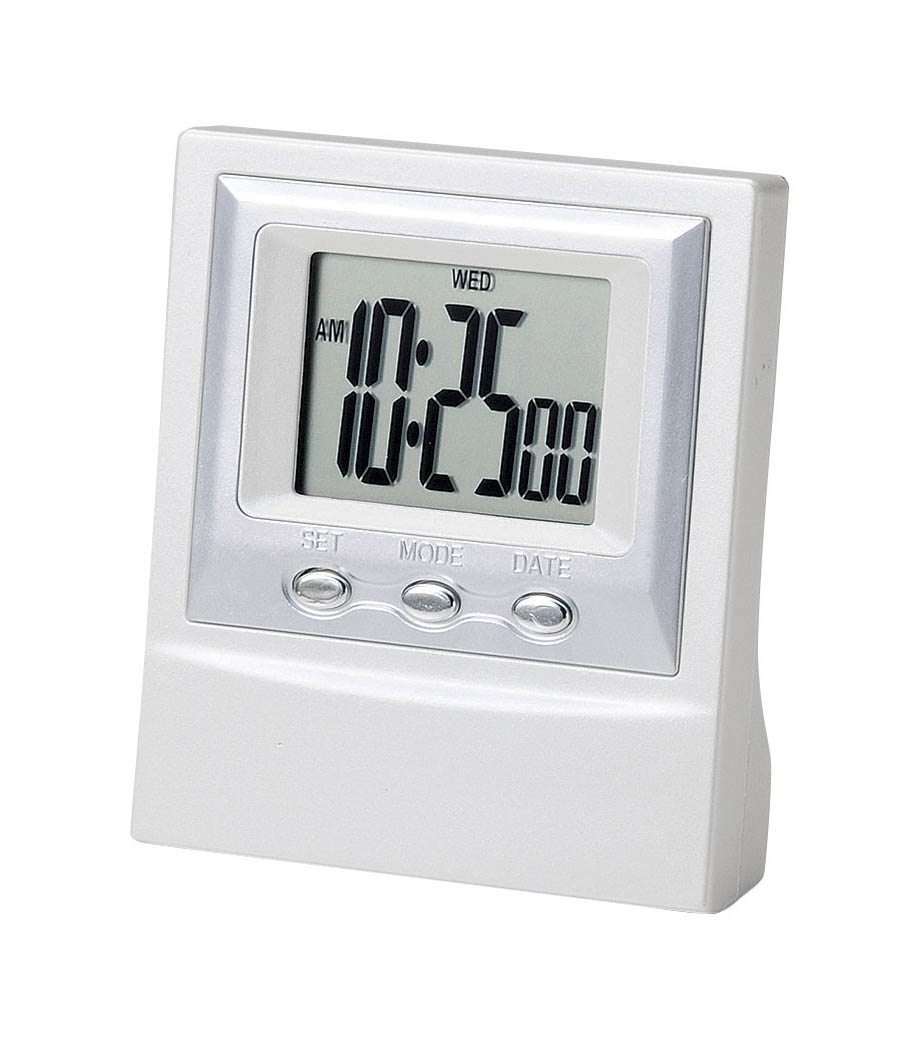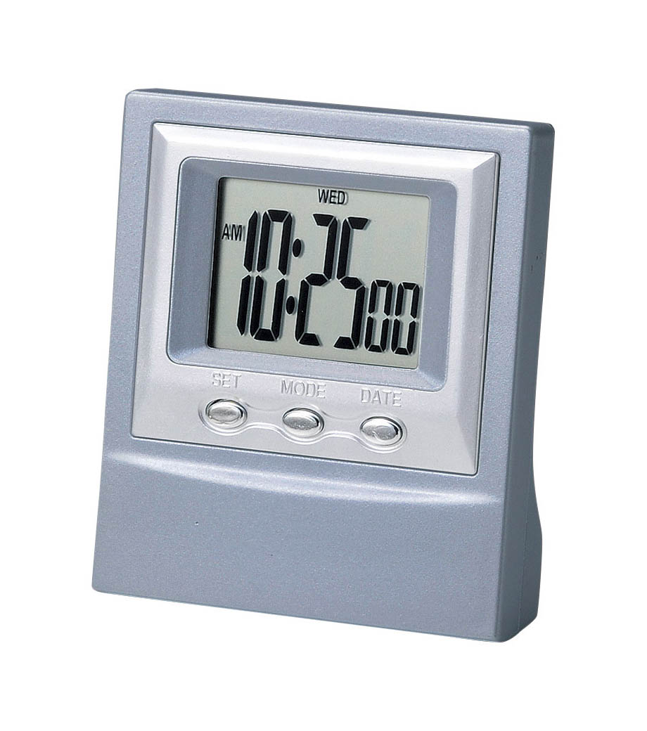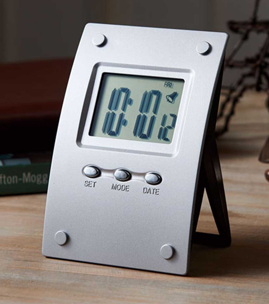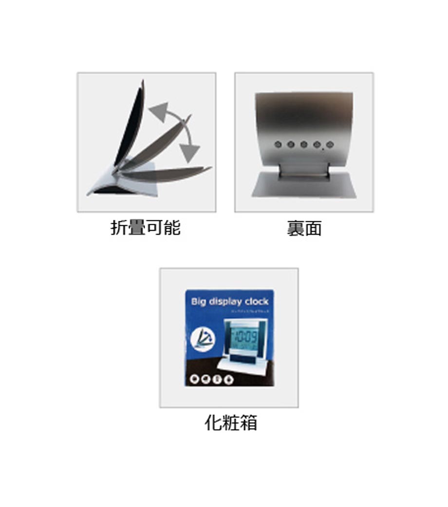 商品のサイズは小さめで、片手に乗るくらいの大きさ。場所を取らずさりげなく置けますが、時刻表示の文字は大きく見やすいです。日付を見たい時は「DATE」ボタンを押すと簡単に見られます。オフィスのデスクの上はもちろん、寝室のベッドサイドに置くのもよいですね。イベントでの配布や、展示会の粗品にオススメの低価格です。