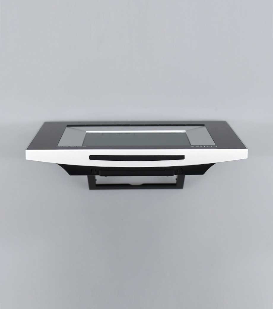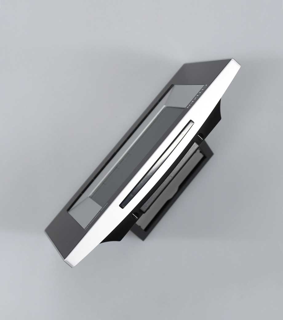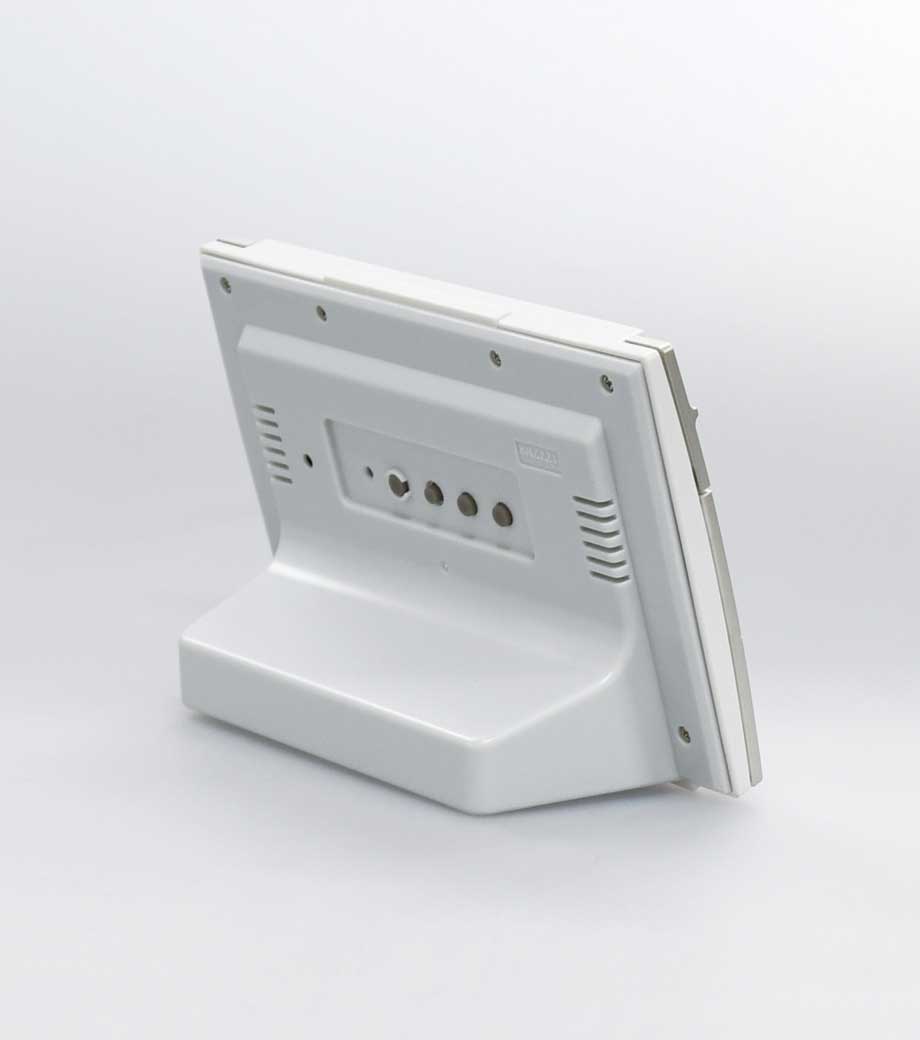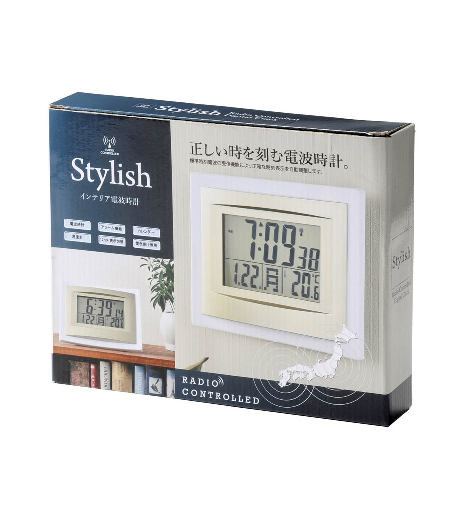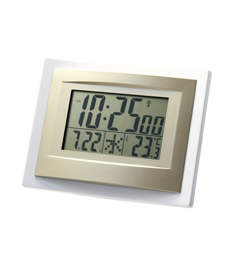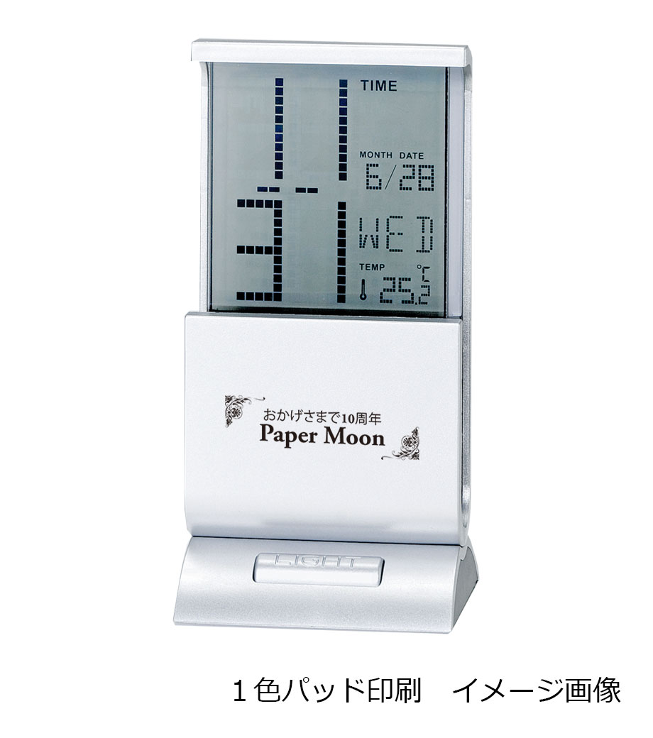 スタイリッシュ インテリア電波時計は、大型液晶で見やすい置き掛け兼用電波時計です。本体上部または下部に1色印刷が可能。