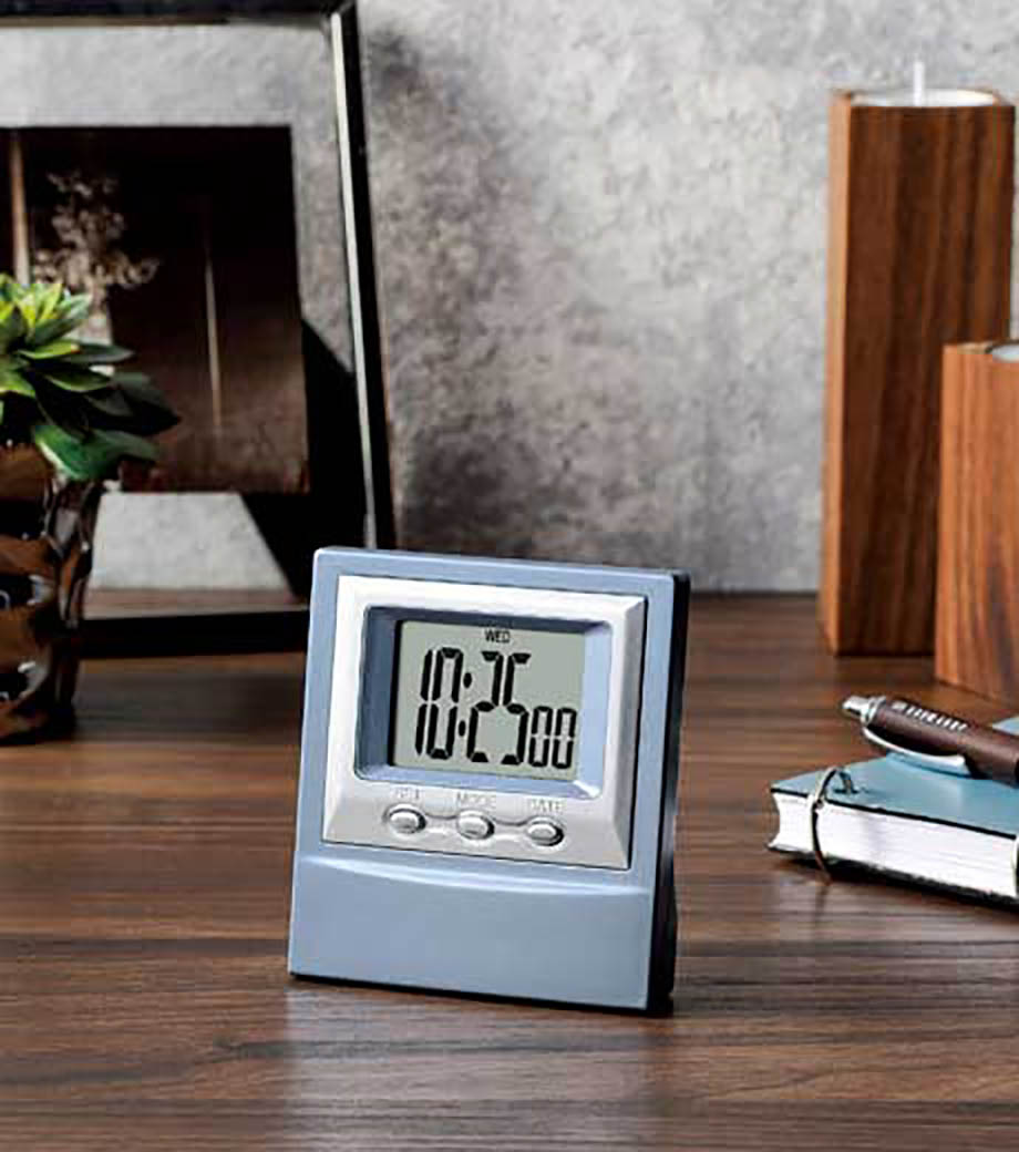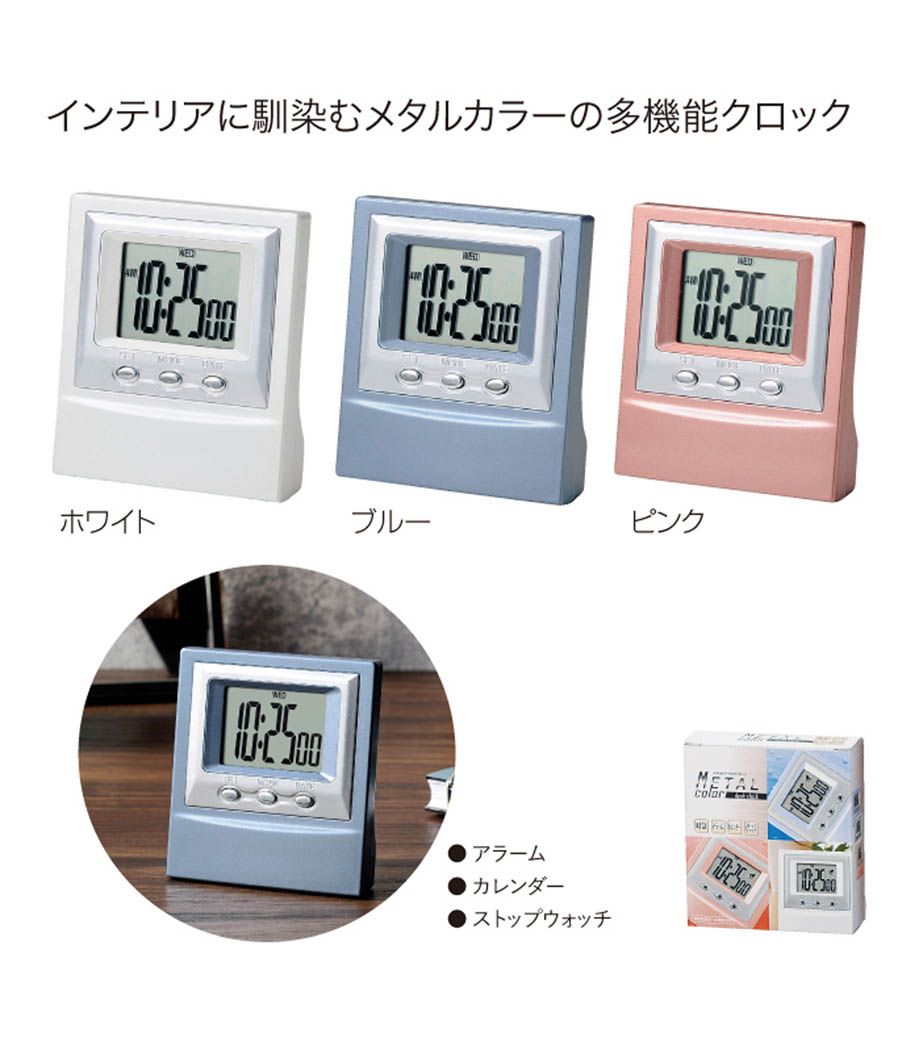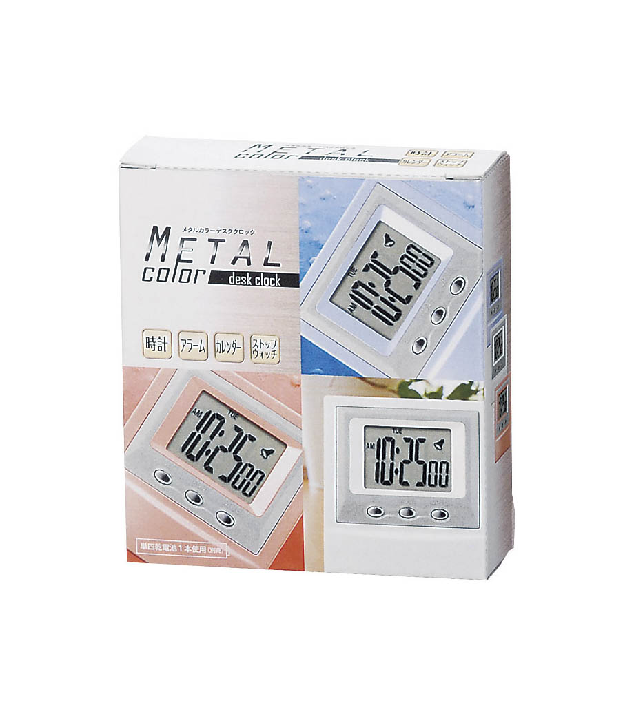 メタルカラー デスククロックは、時計、アラーム、カレンダー、ストップウォッチの機能が備わった小ぶりの置き時計です。