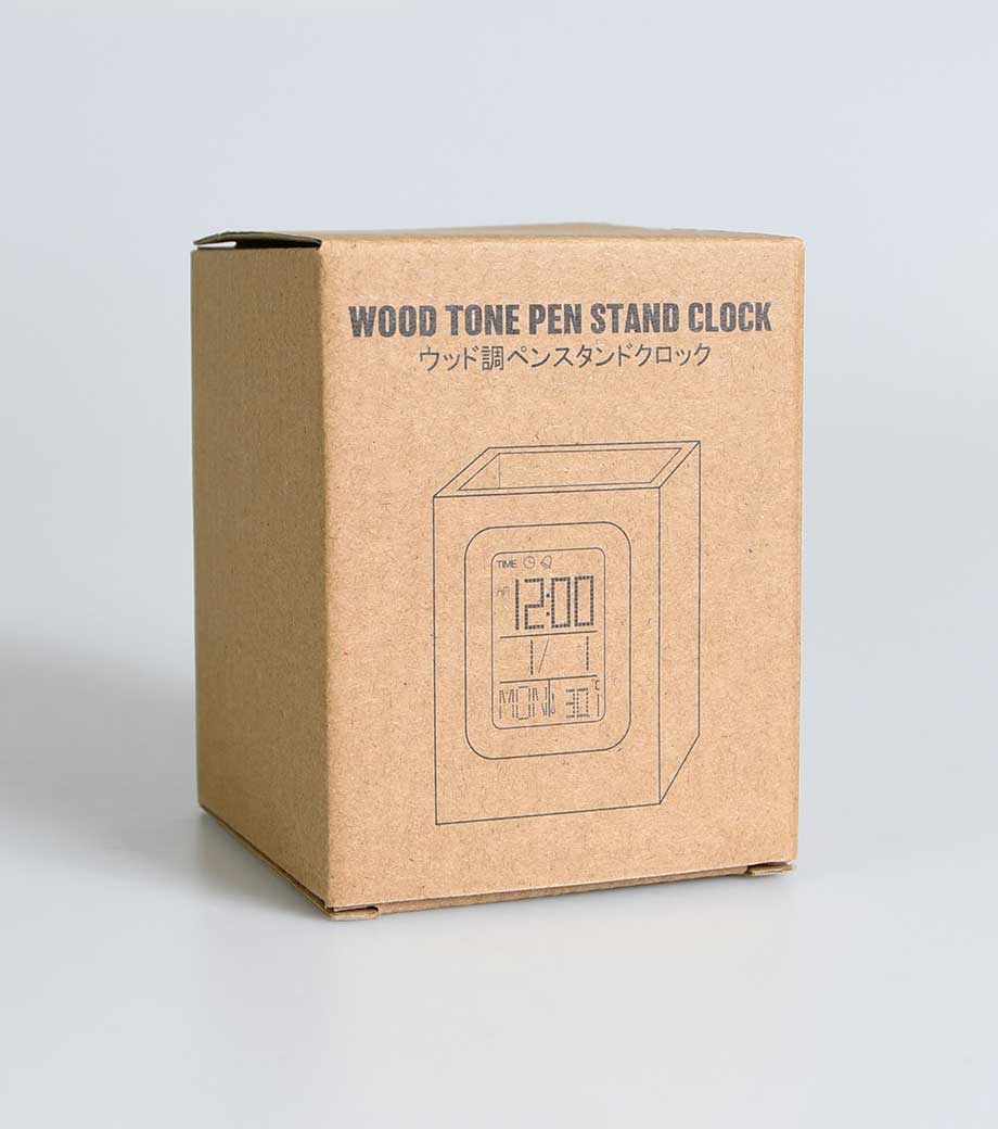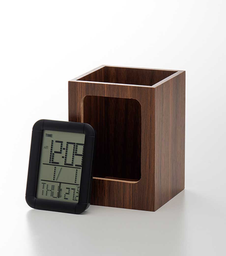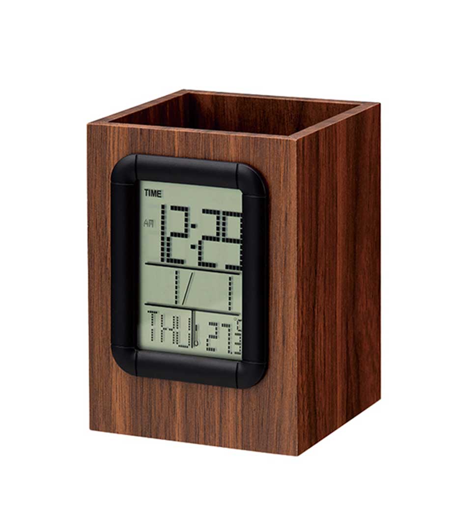 ペンスタンドとして使える便利な多機能クロックです。時計・カレンダー・温度・アラーム・タイマーと機能満載。正面に大きく表示されるので、勉強や仕事に大活躍!材料のMDFは、間伐材や端材のチップでできた環境に優しい素材です。置き場所を選ばない電池式なのもうれしいですね。木目調の落ち着いたデザイ×多機能で、お値段以上の高見えアイテムです。
