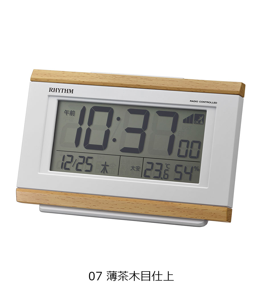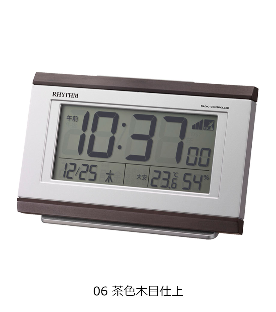 リズム フィットウェーブD161はウッド調のデザインが人気の電波時計です。時刻の文字が大きく、アラーム付きで湿度・温度・六曜表示など多機能です。天面のボタンを押せばバックライトが点灯。暗い場所でも時間を確認できます。