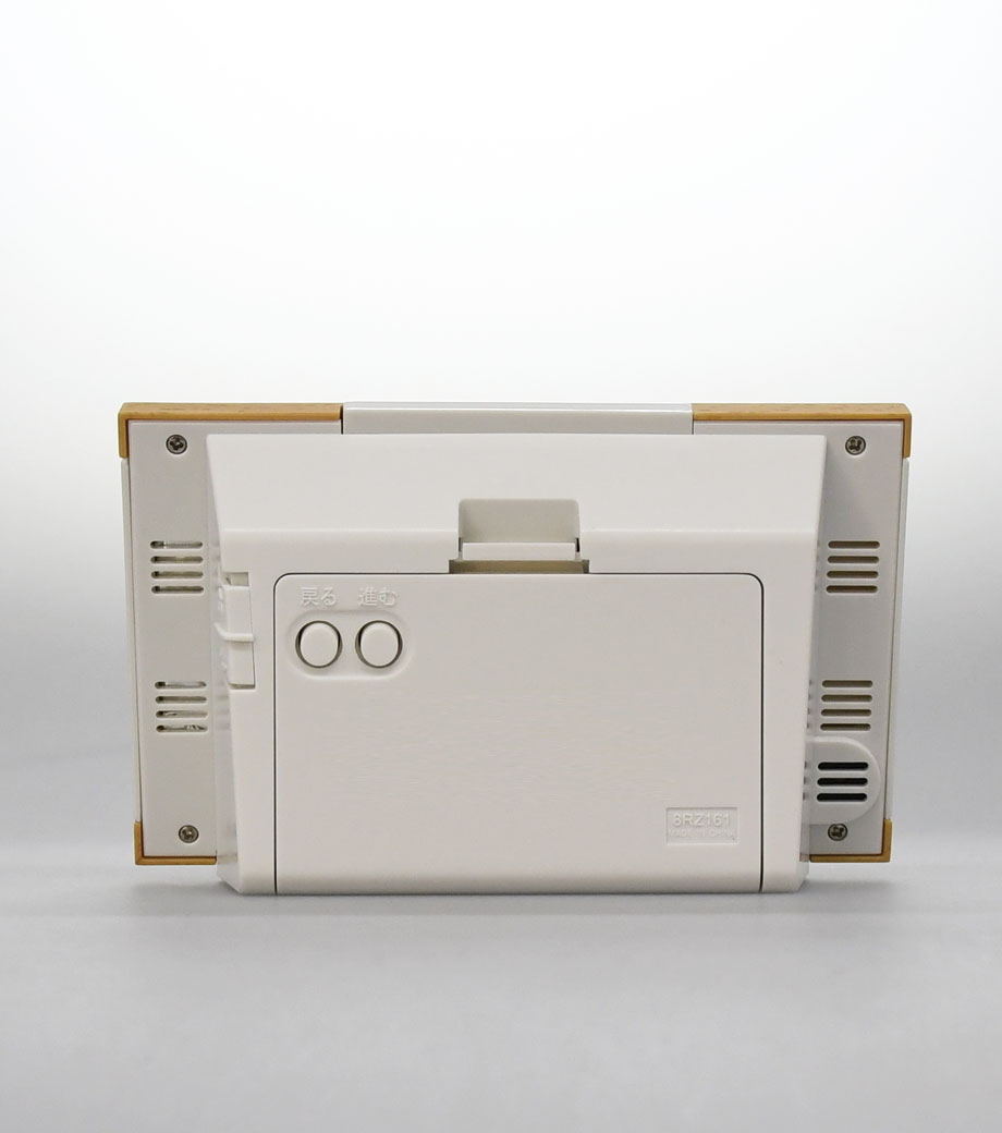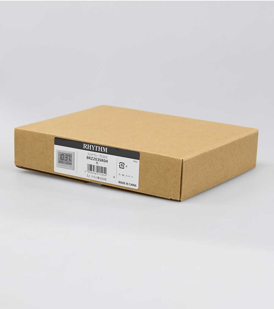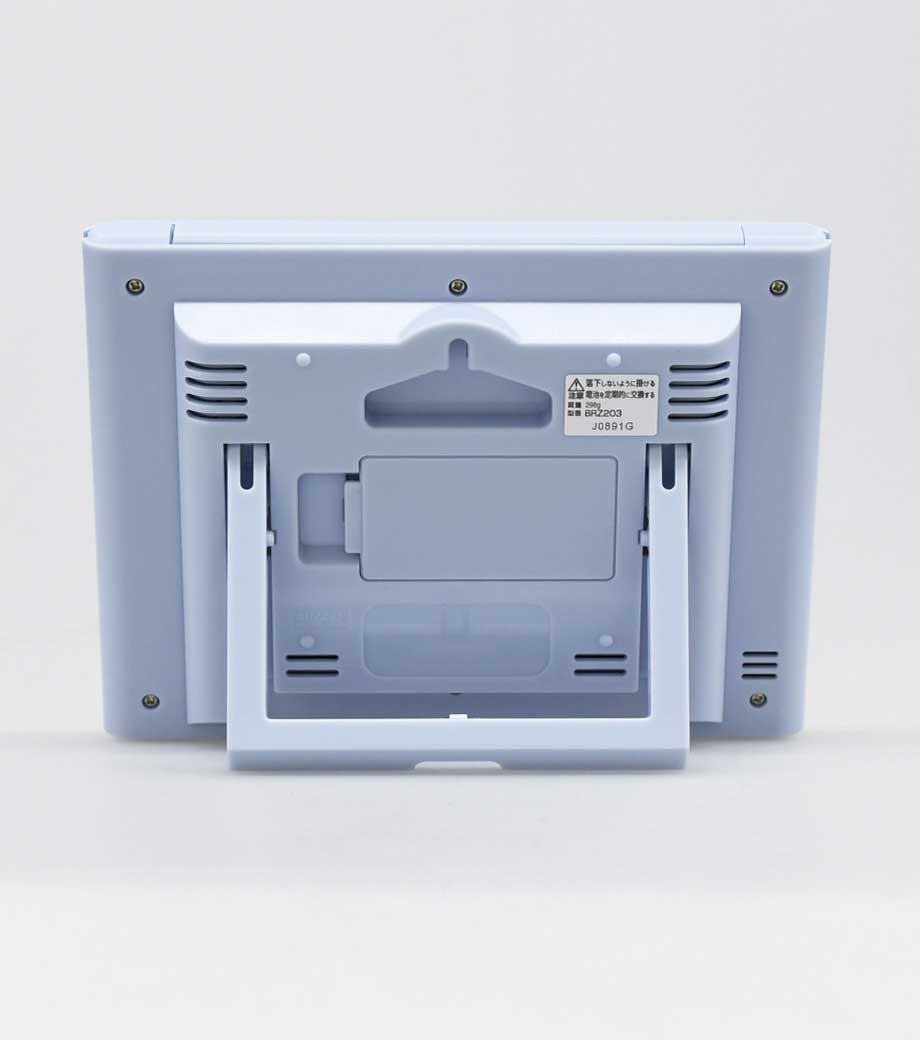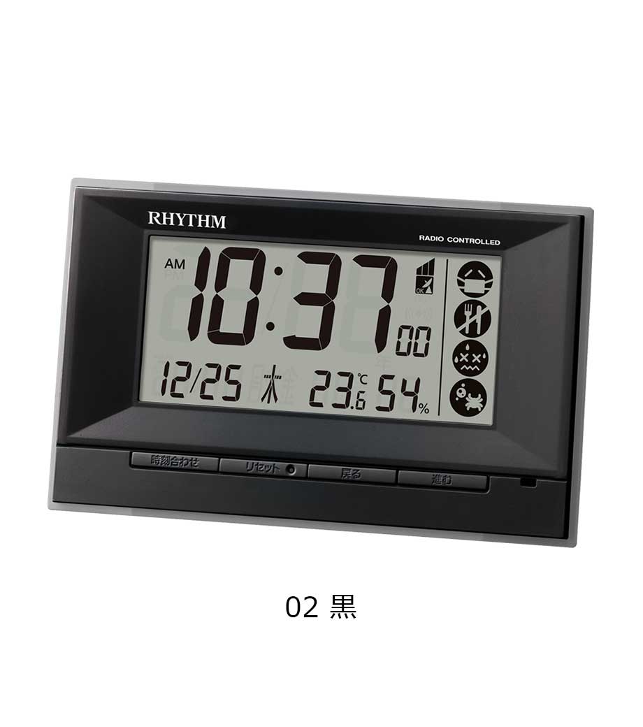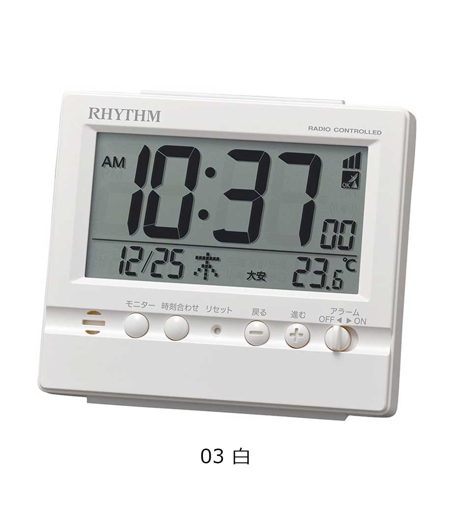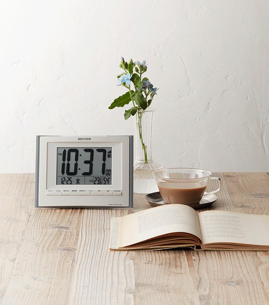 リズム フィットウェーブD203は時刻の文字が大きいデジタル電波時計。単行本と同じくらいの程よいコンパクトなサイズ感ですが、棚の上や壁掛け使用でも時間が見やすいです。温度・湿度・カレンダー・六曜表示にアラーム・スヌーズ付きで機能も充実。操作ボタンは正面に配置されているので設定も簡単です。