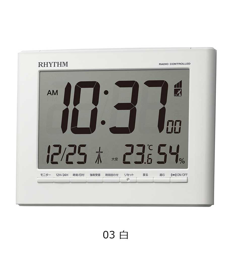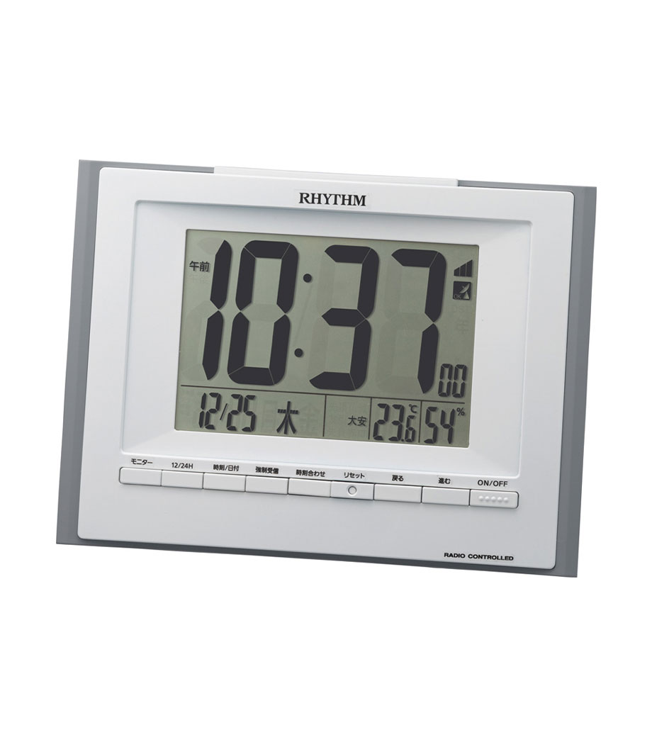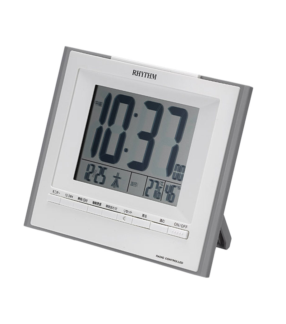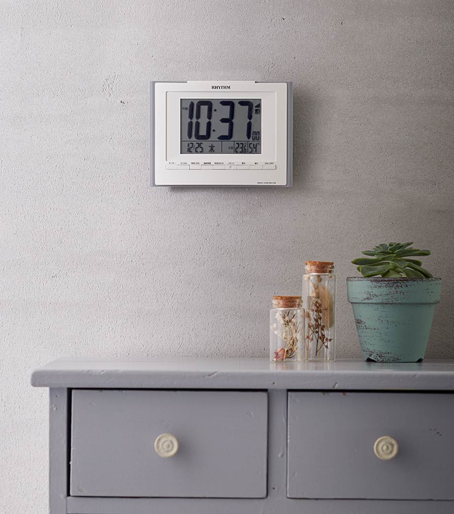リズム フィットウェーブD168は壁掛け・置き時計の両方で使えるコンパクトな電波時計です。湿度・温度・六曜表示やアラームなど、多機能でマルチに活躍します。操作ボタンが表面に設置してあり、設定がスムーズ!シンプルでスタイリッシュな時計は、職場や自宅のリビングなどどんな場所にも馴染みます。
