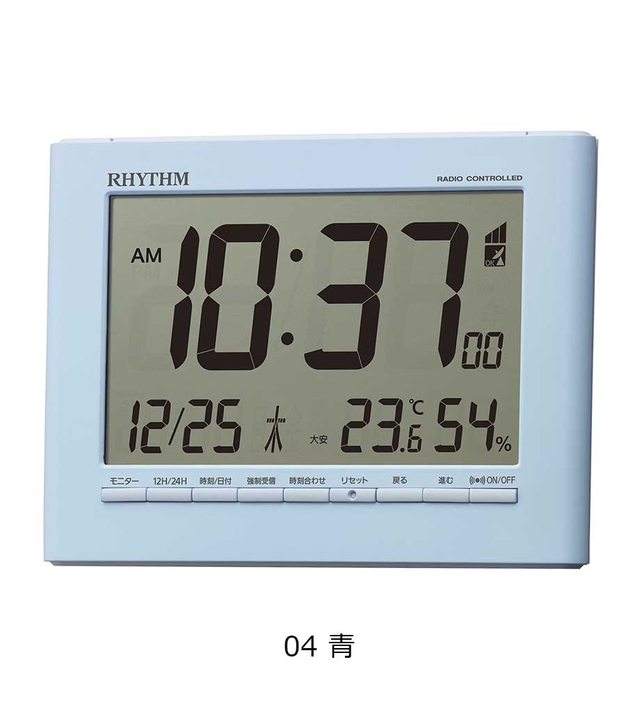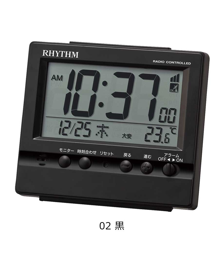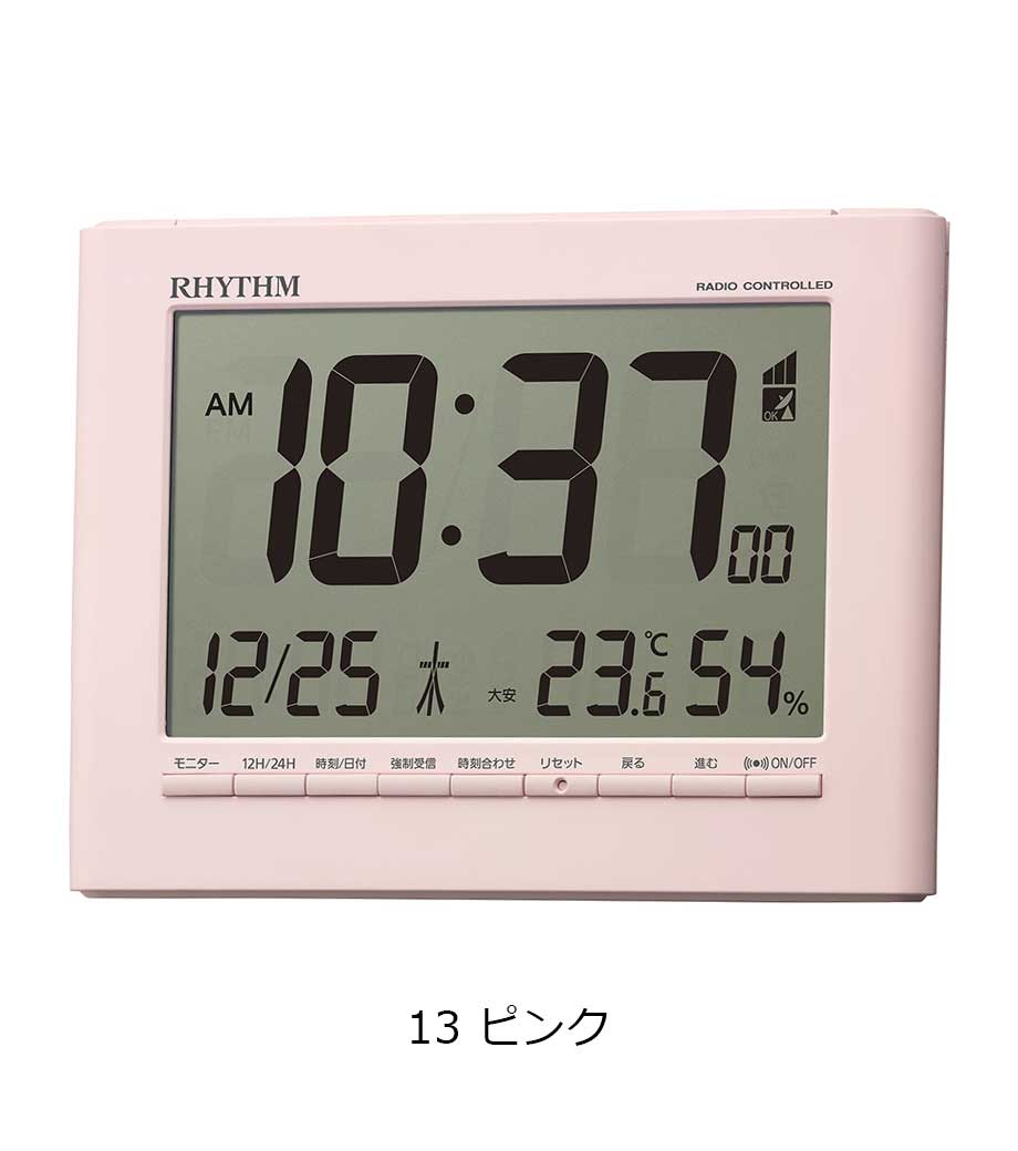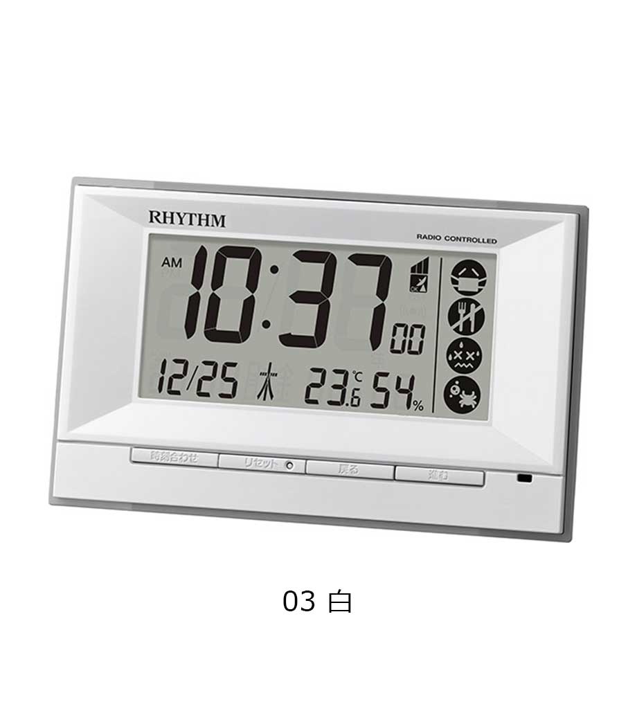 リズム フィットウェーブD168は壁掛け・置き時計の両方で使えるコンパクトな電波時計です。湿度・温度・六曜表示やアラームなど、多機能でマルチに活躍します。操作ボタンが表面に設置してあり、設定がスムーズ!シンプルでスタイリッシュな時計は、職場や自宅のリビングなどどんな場所にも馴染みます。