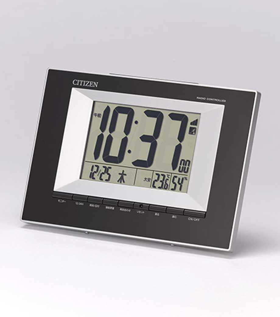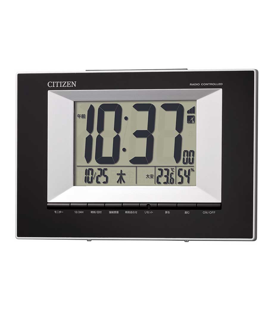 シチズン 掛置兼用デジタル電波目覚まし時計は大きな時刻表示で、遠くからでも見やすい電波時計です。操作ボタンは裏面に配置してあり、スッキリしたデザインになっています。玄関先・病院などの施設の受付で使いやすい掛け置き兼用。温度・湿度・カレンダー・六曜表示も付いています。