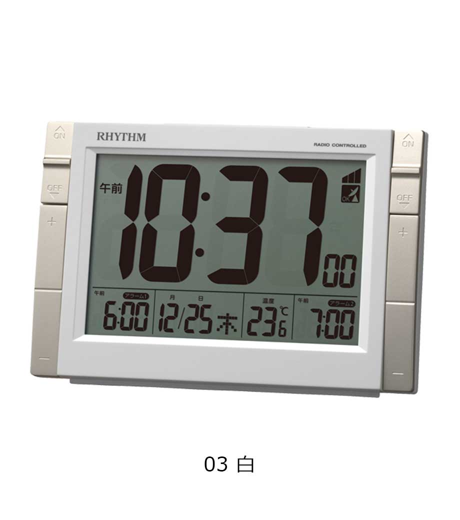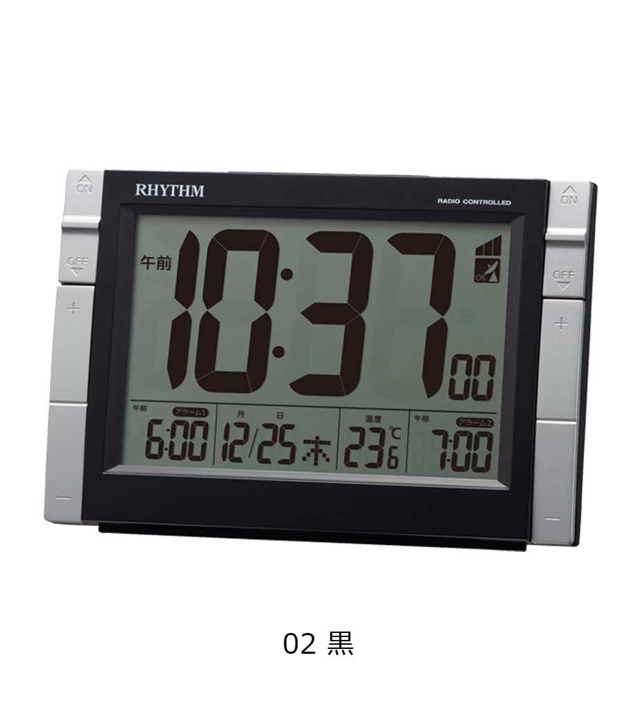 リズム フィットウェーブD223は文字が大きいデジタル電波時計。温度・カレンダー表示と、2パターン設定できるWアラーム機能付きで便利!家族で起きる時間が違っても、1台で使えます。操作ボタンはお部屋に馴染みやすいスッキリしたデザインです。