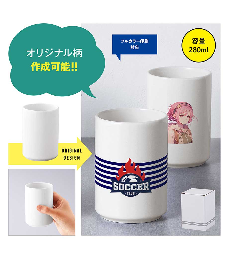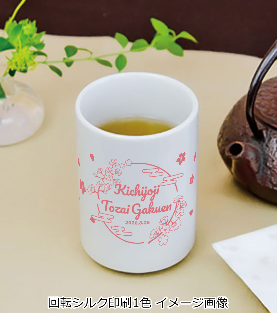 くびれのないストレートな形状なので、オリジナル湯呑づくりにぴったり!ほぼ1周ぐるっと名入れができ、インパクトのあるノベルティ・記念品を制作できます。
