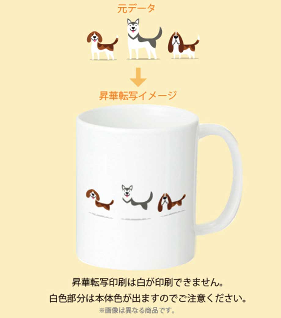 マグカップに転写紙を巻き付けて熱をかけることで、インクを染み込ませる印刷方法です。細かい線がある・印刷色にこだわりがある場合は、実物校正(別途費用)を追加でご案内できます。