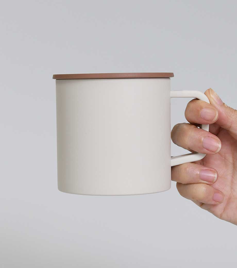 ほこりの侵入を防ぐ便利な蓋付きマグカップです。ステンレス製の真空二重構造だから飲み頃の温度が長く続きます。表面はさらっとマットな質感。樹脂製の取っ手付きで手に馴染み、使いやすさは抜群。