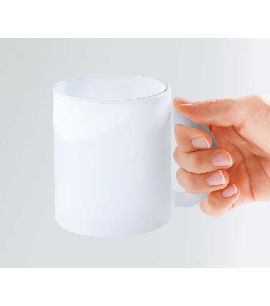 「昇華転写対応グラスマグ(300ml)フロスト」は、すりガラス仕様のガラス製マグ。持ち手が広く、飲みやすいデザインのマグカップです。容量約300mlの丁度良いサイズのマグは、オフィスやリビングで飲み物を楽しむのにぴったりです。ガラス製で本体自体がどっしりと重量感があるので、ちょっとぶつかった位で倒れる心配もありません。