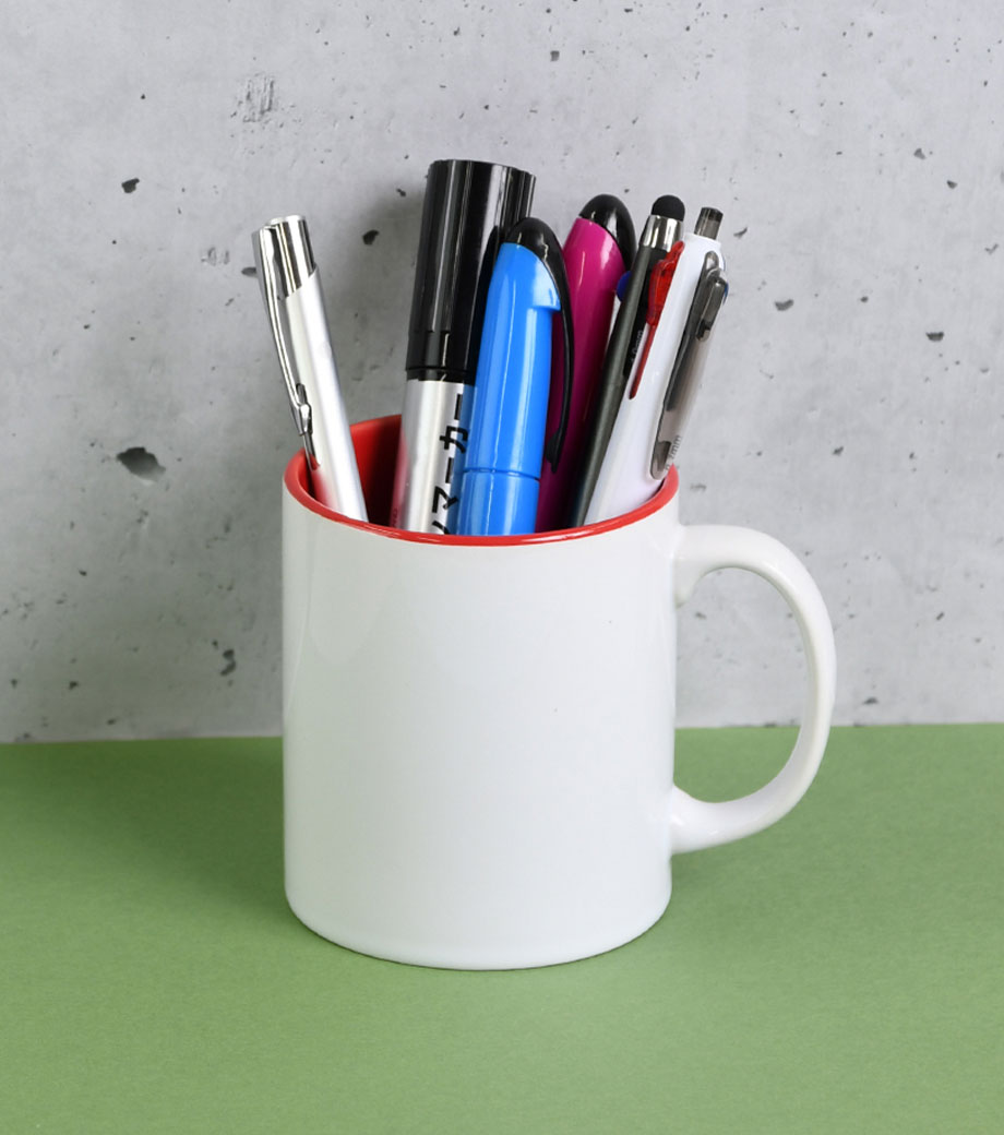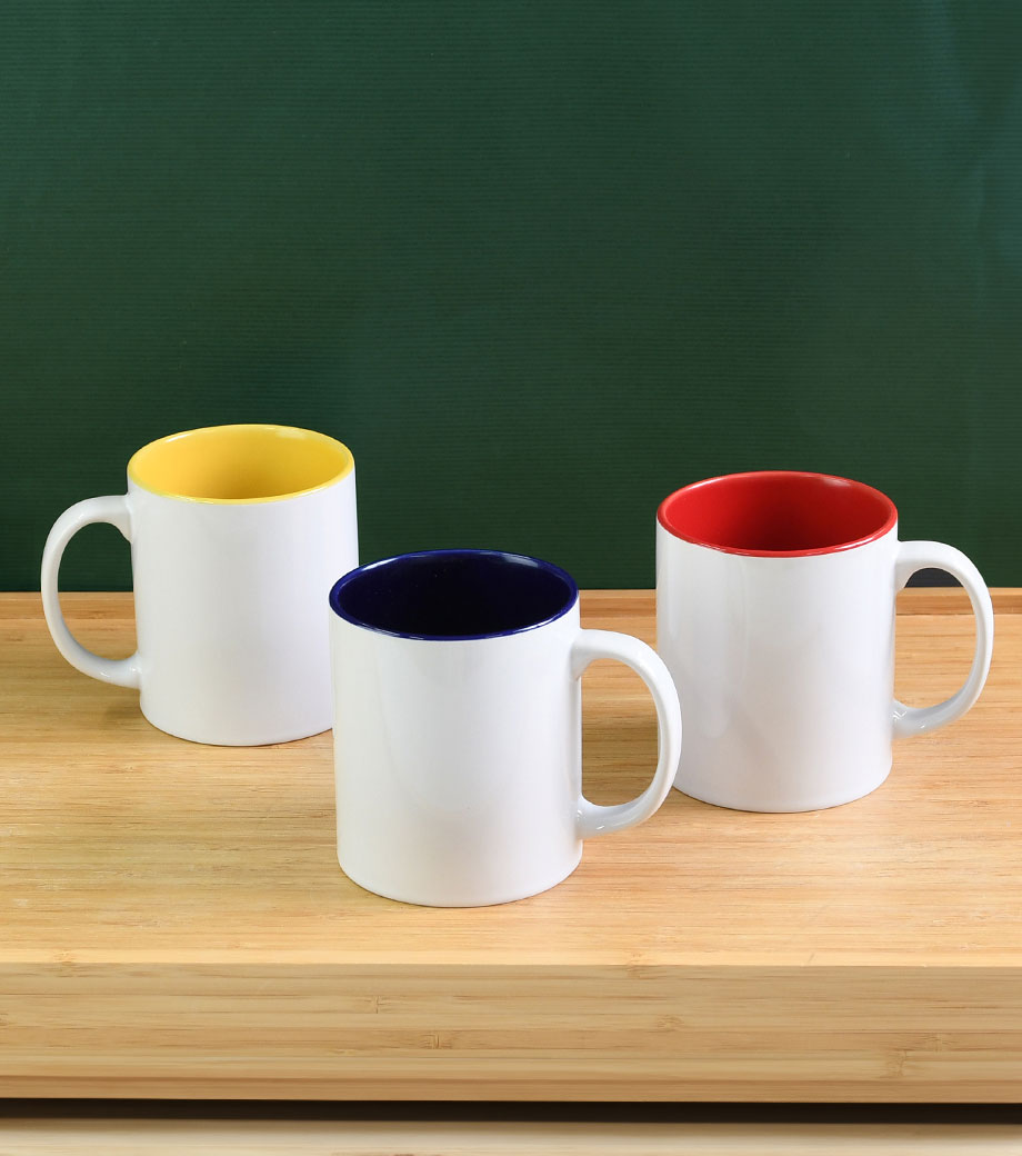 陶器マグストレート バイカラーは内側のポップな配色が可愛いマグカップ。側面はホワイト一色で、大きめに印刷できるフルカラー印刷に対応。集合写真を入れた卒業記念品や周年記念品・キャラクターイラストを入れたグッズ制作に大人気!内側のカラーを生かした推し色グッズにもおすすめですよ。