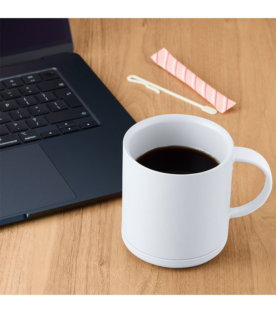 長時間の社内会議やテレワークのお供に最適な容量約450ml。ロゴが映えるシンプルなホワイトボディに名入れをし、開店記念品や周年記念品にいかがでしょうか。